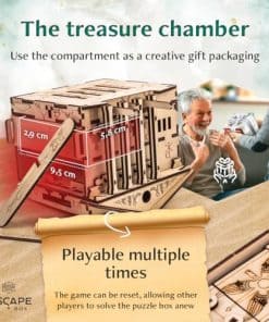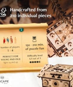 Escape Room Puzzle Box: ¡Prepárate para ser desafiado por nuestras cajas de rompecabezas para adultos! Descubre si lograrás abrir el tesoro y revelar el tesoro de César con el nuevo juego creativo de INSCAPE que llevará tus límites al límite. Nuestra escape room en una caja es una excelente manera de divertirse solo o con familia y amigos. Cada uno de nuestros rompecabezas 3D de desafío cerebral presenta 210 piezas individuales que han sido cuidadosamente ensambladas a mano.