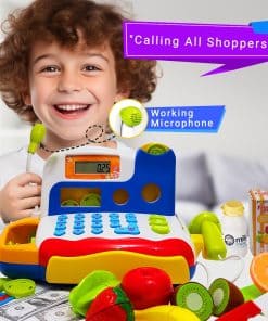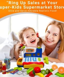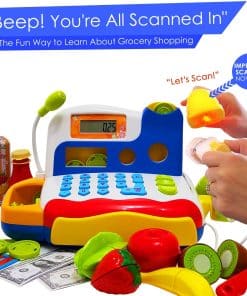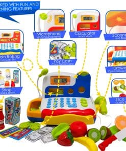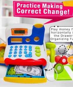 Este conjunto de caja registradora de juguete viene con todos los elementos esenciales. 6 hermosas frutas cortables, una tabla de cortar y un cuchillo, botellas, dinero de juego, tarjetas de crédito y… (la descripción continúa)