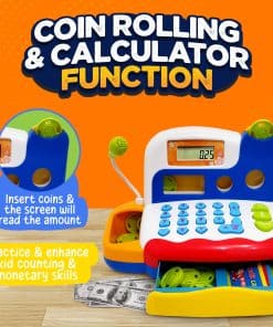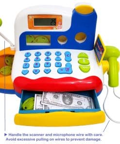 Caja registradora de juguete FUNERICA con escáner, micrófono y calculadora interactiva. Incluye alimentos de supermercado, frutas cortables, dinero de juego – para niños pequeños y niños. Con este inteligente y educativo juguete de caja registradora, mantén a tus hijos entretenidos todo el día. El juego de simulación puede ayudar a tus hijos a ser más sociables, cooperativos y aprender a compartir. Haz que tus hijos participen en un juego de simulación de alimentos, compras y supermercado. ¡Un solo juguete con tantas posibilidades por descubrir!
