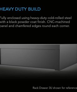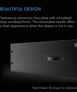 El cajón montable en rack de aluminio AC Infinity está diseñado para ser montado en racks estándar de 19 pulgadas para proporcionar espacio de almacenamiento. El cajón puede contener de forma segura varios equipos en rack como cables, auriculares, herramientas, manuales y micrófonos. Presenta una placa frontal de aluminio anodizado de color negro. Los lados restantes están completamente cerrados con acero de 2 mm de grosor laminado en frío con acabado de recubrimiento en polvo, y una ranura de paso de cable en la parte trasera. Este cajón de rack ocupa 2U de espacio y viene con una alfombra y un juego de tornillos de montaje en rack de 10-32. Incluye cerradura opcional y llaves para uso de seguridad. Construcción Premium La placa frontal de aluminio está construida a partir de un bloque sólido de aleación de aluminio de alta calidad con un grosor de 3 mm, luego terminado con un aspecto negro cepillado. El panel es luego mecanizado por CNC, redondeando cada esquina y biselando cada borde para un aspecto sofisticado. El asa está diseñada para estar oculta cuando no se usa para un aspecto limpio y se puede retraer cuando necesite abrir el cajón. Este diseño lo convierte en el complemento perfecto para racks de audio/video y home theater de alta gama.