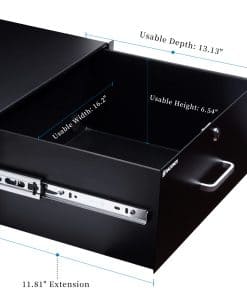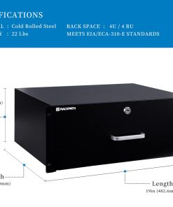 El cajón para montaje en rack de 4U de RackPath es la solución perfecta para almacenar de forma segura y organizada su equipo no montable en rack, herramientas, documentos y accesorios. Con una capacidad de peso de 22 libras, este cajón resistente está construido con acero laminado en frío de alta calidad y cuenta con un acabado duradero de polvo electrostático negro. Las dimensiones de 19″ de largo x 14.3″ de profundidad x 7″ de altura, con una extensión de cajón de 11.81″, le brindan un amplio espacio para almacenar sus equipos de DJ, grabación y más. Además, con su diseño compatible con EIA/ECA – 310, este cajón se adapta perfectamente a racks, gabinetes y armarios de servidor estándar de 19 pulgadas. ¡Proteja su equipo y manténgalo organizado con el cajón para montaje en rack de 4U de RackPath!