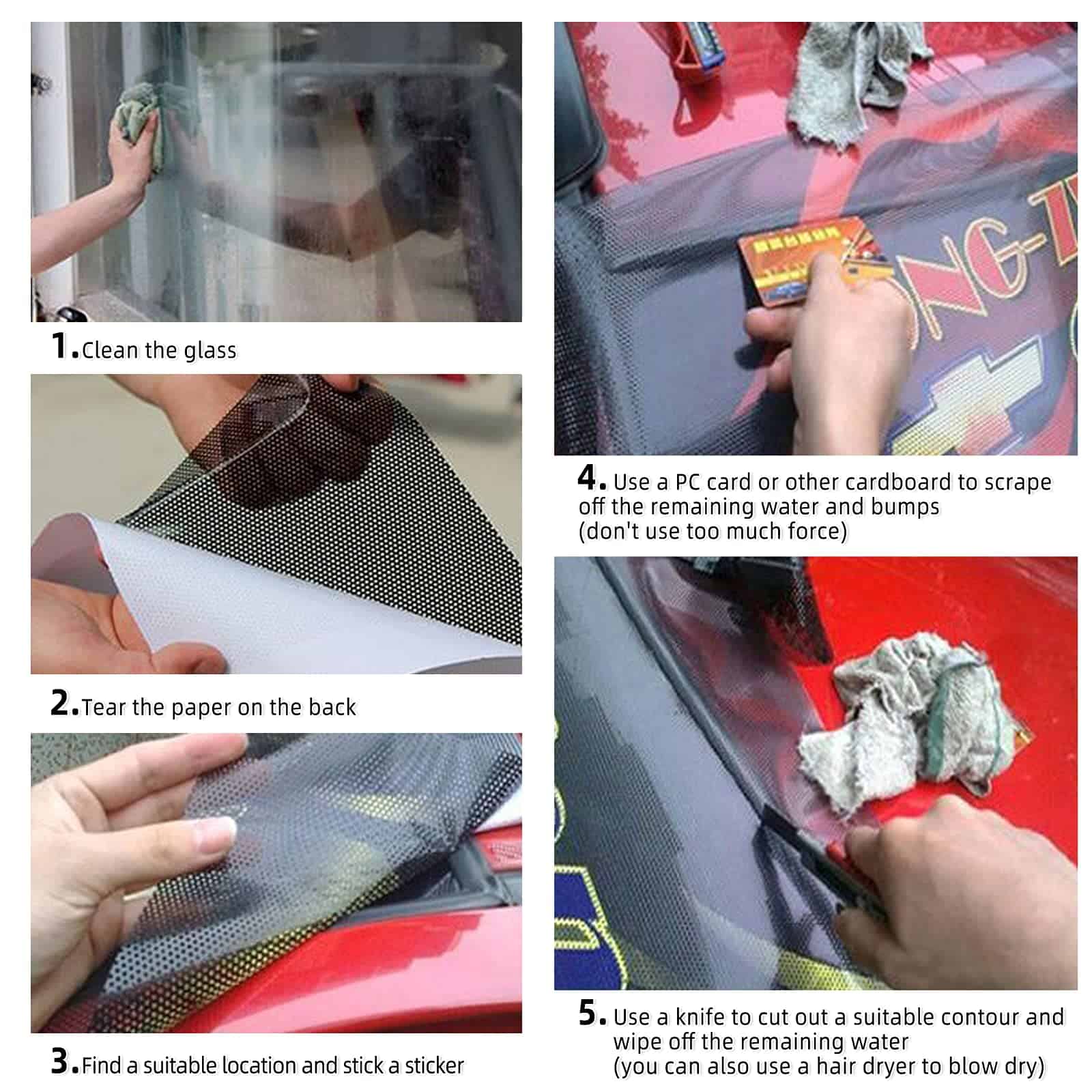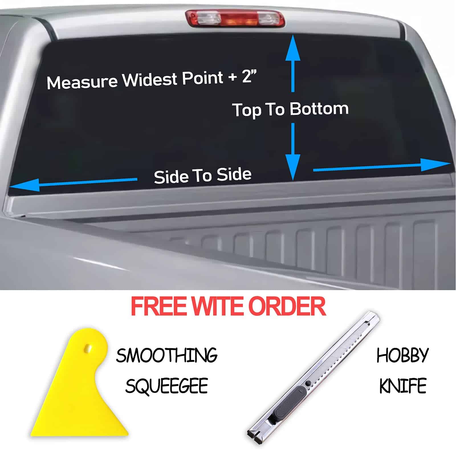 Contenido del paquete: Calcomanías para ventana trasera de camionetas 1, Escurridor suavizante 1, Cuchillo de hobby 1.