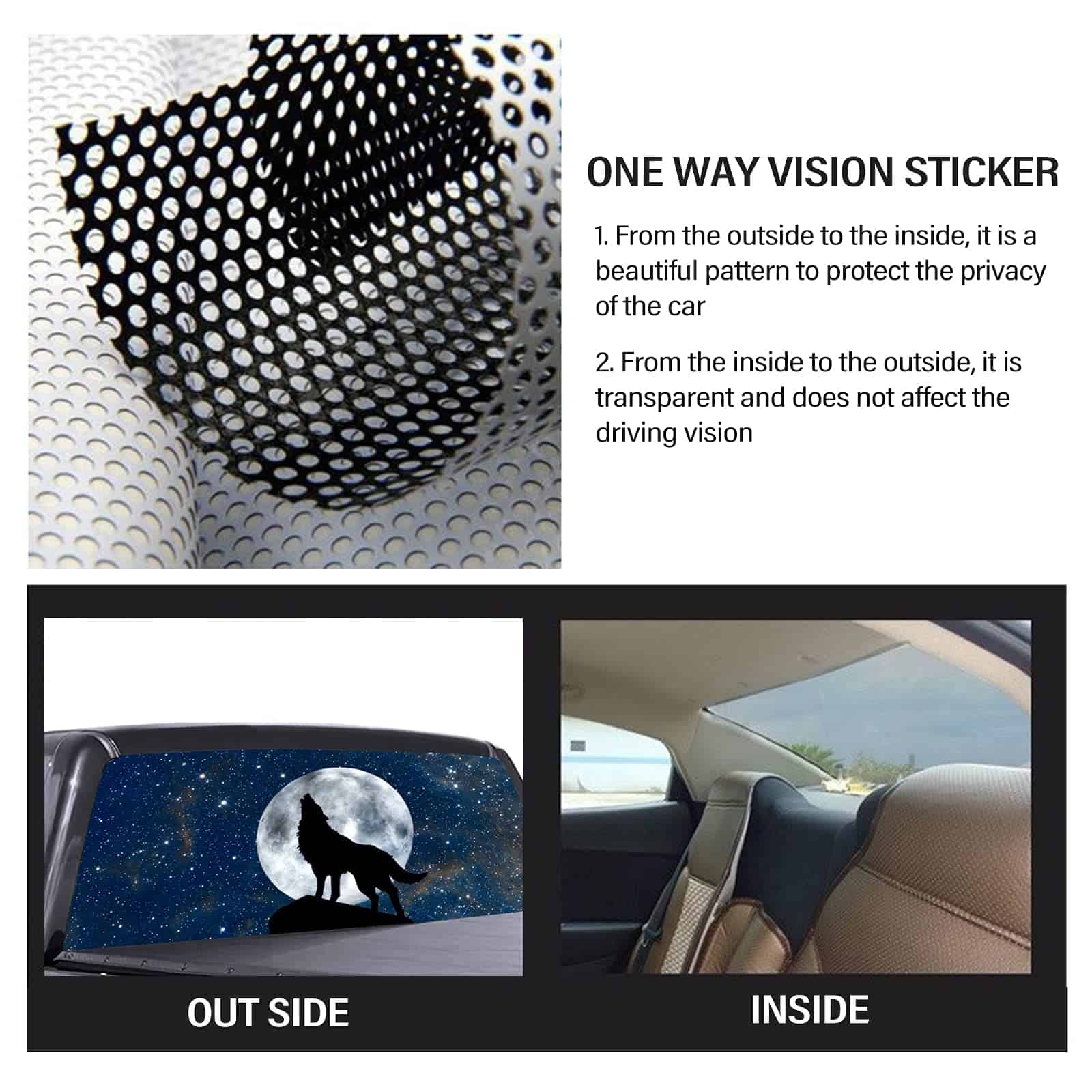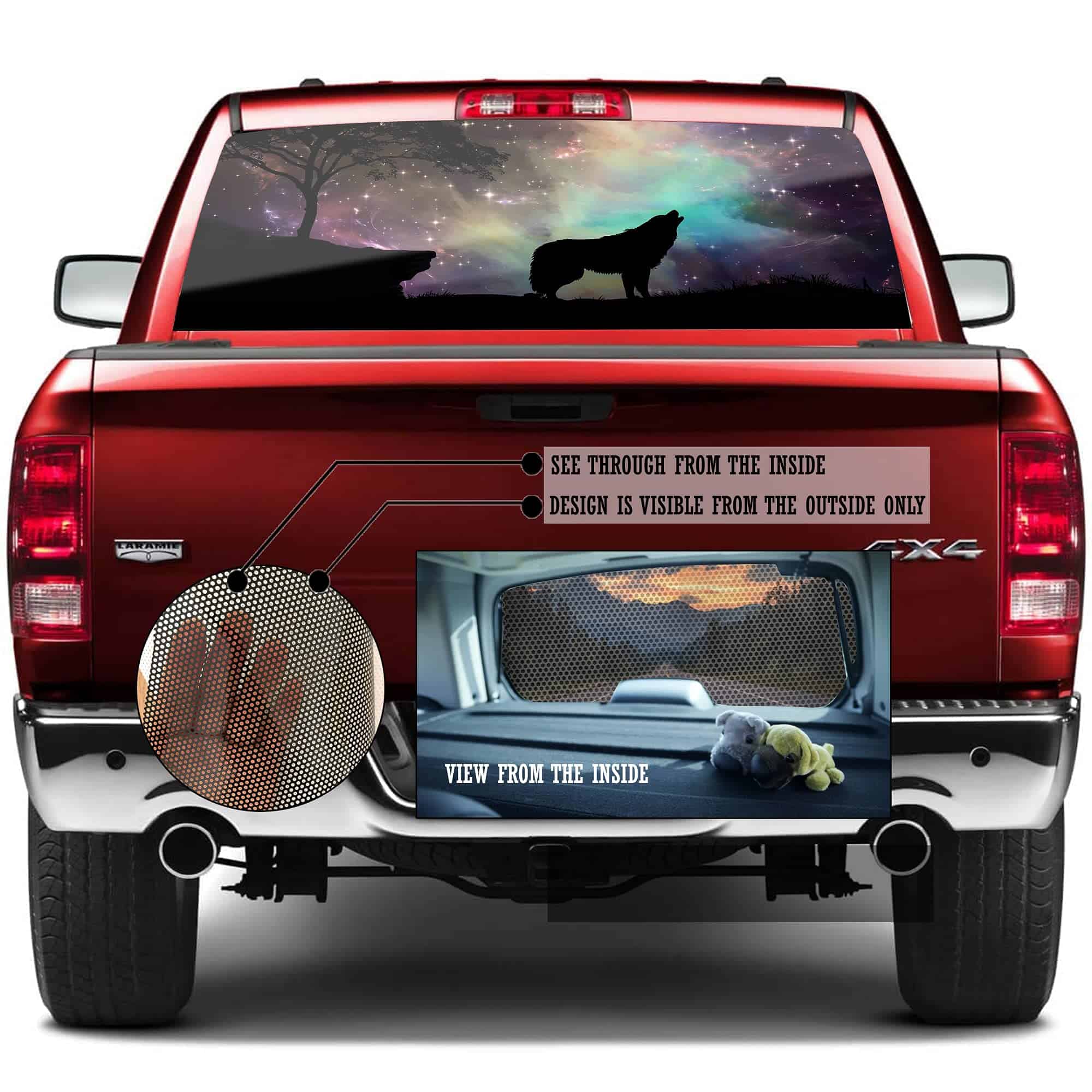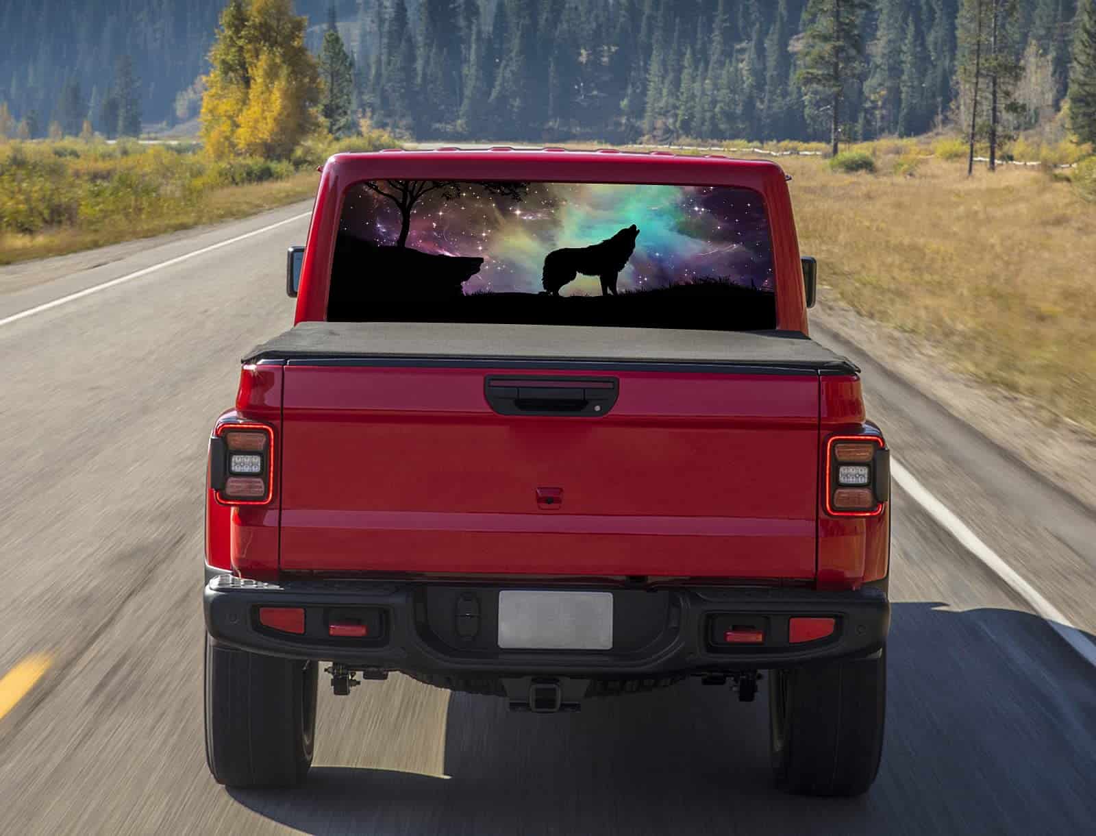 Agrega un gráfico personalizado a tu vehículo usando nuestras calcomanías personalizadas de ventana perforada.
