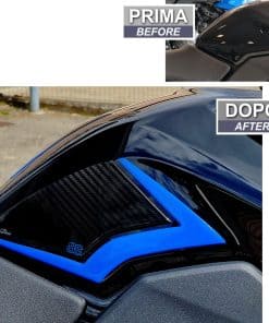 Manipule la calcomanía exclusivamente desde los bordes evitando tocar la parte adhesiva con las manos. Aplique el adhesivo manteniéndolo perfectamente alineado con la forma de la moto para evitar acciones de pegado y despegado que podrían comprometer la estanqueidad del pegamento con el tiempo. Se recomienda empezar por un lado y eliminar suavemente cualquier burbuja de aire a medida que avanza hacia el lado opuesto.