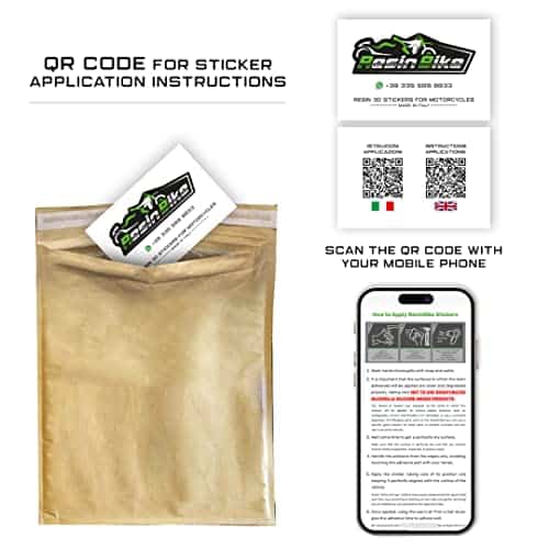 Calcomanías de resina de moto de Resin Bike diseñadas y probadas para ofrecer alto rendimiento, ideales para decorar y proteger tu moto de rayones, golpes y el clima. Realzan la estética de tu moto con estilo y personalidad. La empresa italiana Resin Bike se especializa en la creación de llaveros, gráficos adhesivos de resina con efecto 3D personalizado para proteger y decorar scooters, motos de carretera y motos de cross. Utiliza técnicas de impresión de alta definición y digital a cuatro colores con colores brillantes de alta calidad que no se desvanecen con el tiempo gracias a un tratamiento especial contra los rayos UV. Para una buena adhesión del producto, se recomienda lavar las manos con jabón, limpiar la superficie donde se aplicará el adhesivo con un paño suave, seco y limpio que no suelte residuos, y en caso de suciedad persistente, se puede utilizar un limpiador de vidrios o desengrasante líquido. Finalmente, seca bien la superficie y procede con la aplicación del adhesivo. Fácil de aplicar manteniéndolo perfectamente alineado a la forma de la moto para evitar acciones de pegado y despegado que podrían comprometer la estanqueidad del pegamento con el tiempo. Incluye calcomanías de resina 3D para motos, fabricadas en Italia.