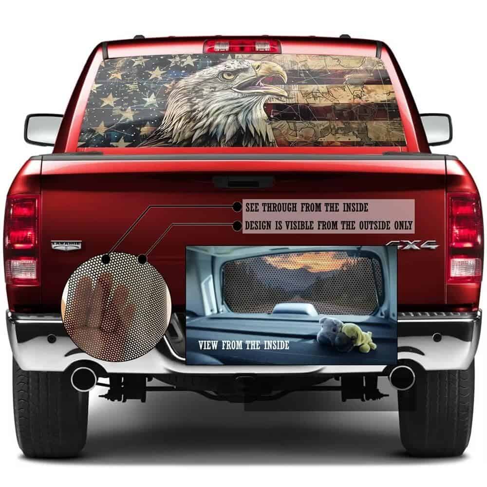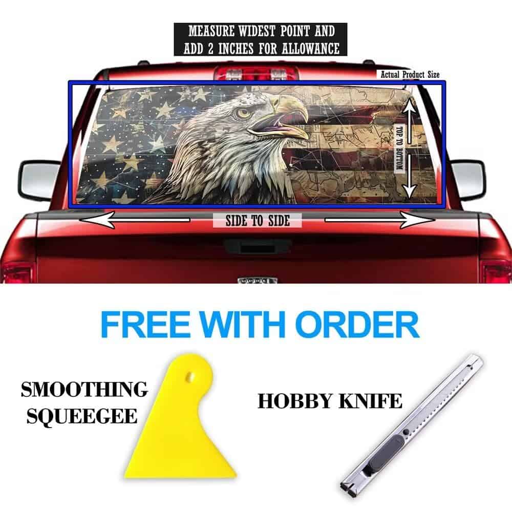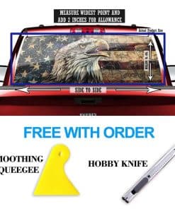 La Calcomanía Gráfica Perforada de Bandera Americana para Ventanas es una forma sencilla y única de agregar el toque justo a su vehículo. Diseño único para su automóvil. Muestre su personalidad a dondequiera que vaya. Características: Material – calcomanía de vinilo perforado de alta calidad 50/50 Impreso digitalmente en alta resolución, utilizando tintas solventes de alta calidad que proporcionan durabilidad a largo plazo y colores vívidos. El gráfico se instala en la SUPERFICIE exterior de la ventana y se ve a través desde el interior. Los gráficos para coches son fáciles de aplicar y fáciles de quitar, solo despegue, aplique y recorte. 4 tamaños 135×35 cm (53″x14″ pulgadas) para camiones pequeños 147×46 cm (58″x18″ pulgadas) para camiones medianos 165×56 cm (65″x22″ pulgadas) tamaño estándar (se adapta a la mayoría de las ventanas de camiones) 168×70 cm (66″x28″ pulgadas) para camiones grandes y SUV Los tamaños de los gráficos se producen ligeramente más grandes para permitir el recorte después de la instalación. Fácil de recortar. Paquete: Calcomanías de ventanas traseras para camiones 1 espátula alisadora 1 cuchillo de hobby 1