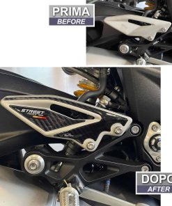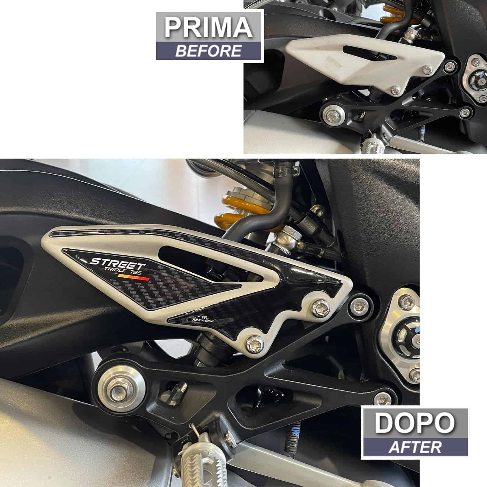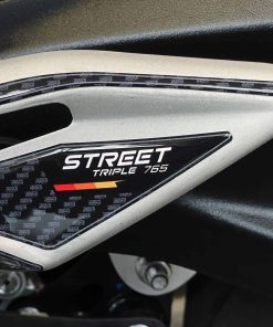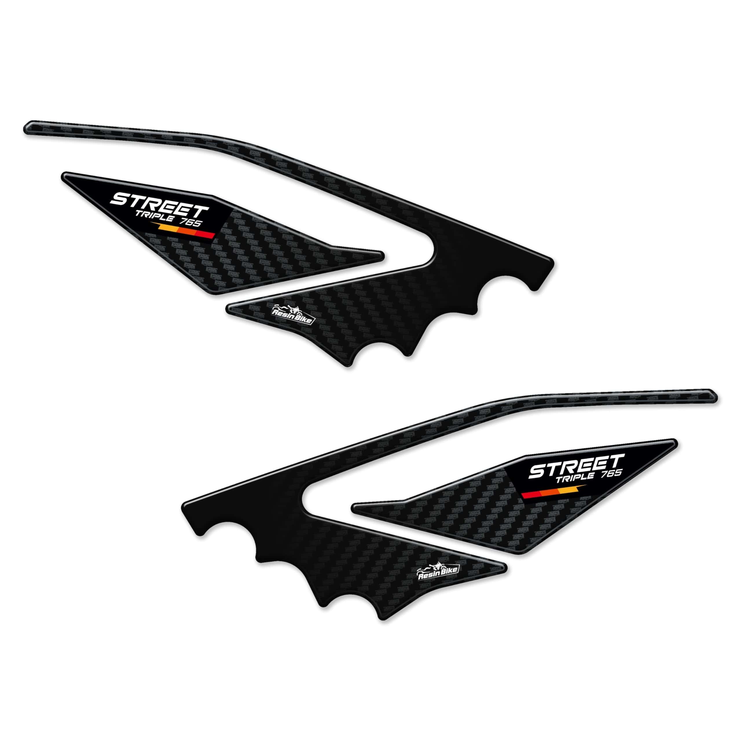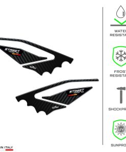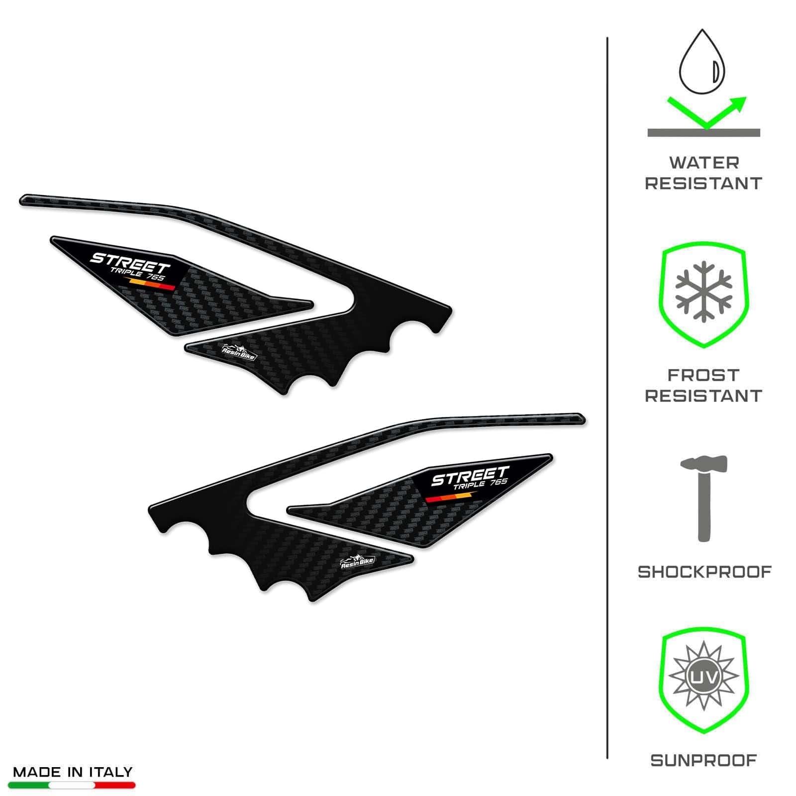 Calcomanías de resina para moto 3D compatibles con Triumph Street Triple 765 RS 2023. Protecciones de talón de puerta contra impactos y arañazos. Par de calcomanías de resina – Hechas en Italia. Todas las calcomanías de motocicletas Resin Bike son duraderas y están HECHAS EN ITALIA, diseñadas y probadas para ofrecer un alto rendimiento, ideales para decorar y proteger tu moto de arañazos, golpes y el clima. Las calcomanías de resina para moto mejoran la estética de tu moto con estilo y personalidad. Resin Bike es una empresa italiana especializada en la creación de llaveros, gráficos adhesivos de resina con efecto 3D personalizado para proteger y decorar scooters, motocicletas de carretera y motocross. La compañía renueva constantemente sus creaciones para ofrecerte una amplia gama de accesorios de motocicleta de calidad con gráficos únicos. El equipo de diseñadores gráficos, unidos por la pasión por las dos ruedas, diseña y crea las líneas modernas de Resin Bike compatibles con tu moto. Para ofrecerte lo mejor, Resin Bike utiliza técnicas de impresión de alta definición e impresión digital a cuatro colores con colores brillantes de alta calidad que no se desvanecen con el tiempo gracias a un tratamiento especial mediante el cual la resina utilizada se convierte en un filtro contra los rayos UV. Para una buena adhesión del producto, recomendamos lavar las manos con jabón para evitar transferir grasa o suciedad. Limpia la superficie donde se aplicará el adhesivo con un paño suave, seco y limpio que no suelte residuos. En caso de suciedad persistente, se puede usar un spray común para limpiar vidrios o un desengrasante líquido. Por último, seca bien la superficie y procede con la aplicación del adhesivo. Manipula la calcomanía exclusivamente desde los bordes evitando tocar la parte adhesiva con las manos, aplica el adhesivo manteniéndolo perfectamente alineado con la forma de la moto para evitar acciones de pegado y desprendimiento que podrían comprometer la estanqueidad del pegamento con el tiempo. Recomendamos comenzar en un lado y eliminar suavemente cualquier burbuja de aire a medida que avances hacia el lado opuesto