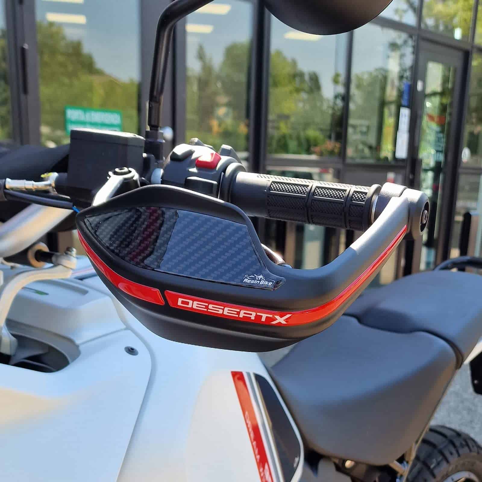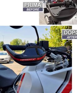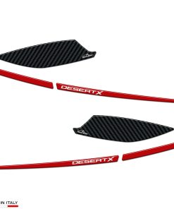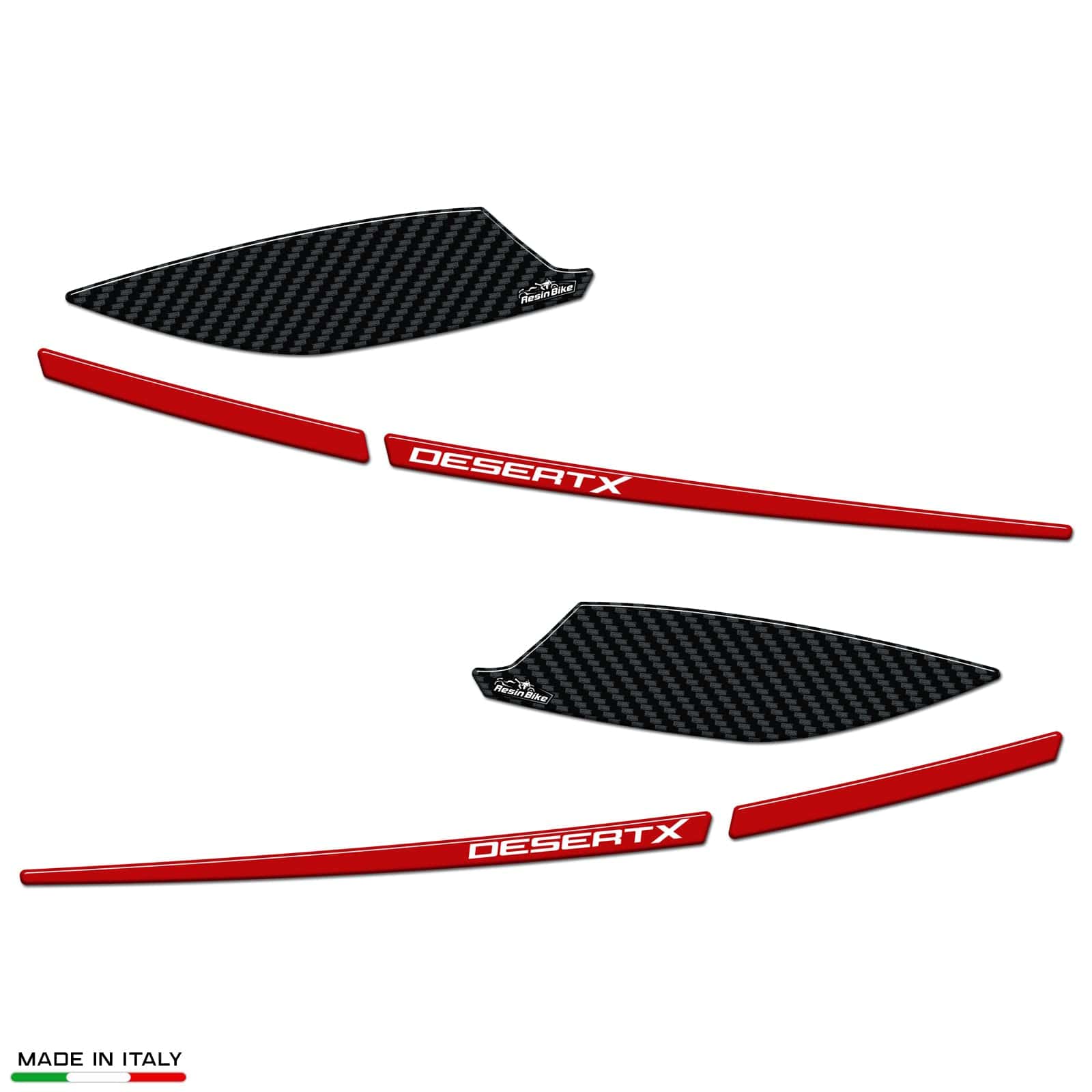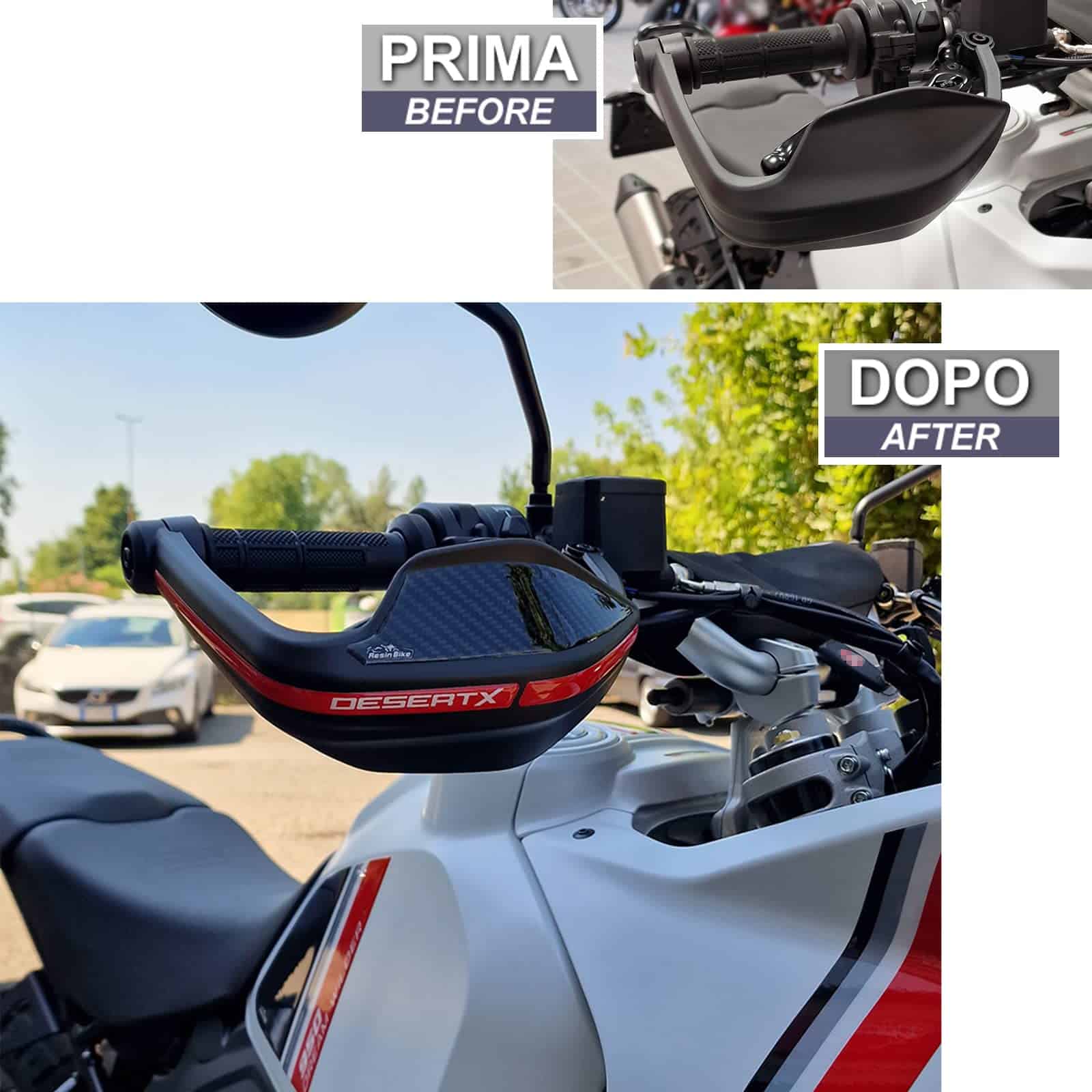 Calcomanías de Resina para motocicleta compatible con Ducati DesertX 2022. Protecciones de manillar contra impactos y rayones. Las calcomanías de resina para motocicleta de Resina Bike son duraderas, diseñadas y probadas para ofrecer un alto rendimiento y proteger tu moto de rayones, golpes y condiciones climáticas adversas. Hechas en Italia, estas calcomanías realzan la estética de tu moto con estilo y personalidad. Resina Bike es una compañía italiana especializada en la creación de llaveros y gráficos adhesivos de resina con efecto 3D personalizado para proteger y decorar scooters, motos de carretera y motos todoterreno. El equipo de diseñadores gráficos, apasionados por las dos ruedas, constantemente renueva sus creaciones para ofrecerte una amplia gama de accesorios de calidad con gráficos únicos. Las calcomanías de Resina Bike utilizan técnicas de impresión de alta definición y digital de cuatro colores con colores brillantes que no se desvanecen gracias a un tratamiento especial de protección contra los rayos UV. Para aplicarlas, se recomienda lavarse las manos con jabón para evitar transferir grasa o suciedad y limpiar la superficie de la moto con un paño suave y limpio. Si hay suciedad persistente, se puede usar un limpiador de vidrios o desengrasante líquido. Finalmente, seca la superficie y aplica la calcomanía manteniéndola alineada con cuidado para evitar problemas de adhesión a largo plazo. Disfruta de la protección y estilo que las calcomanías de Resina Bike traen a tu moto.