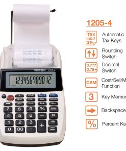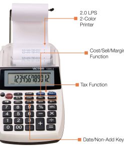 La Calculadora Comercial Portátil de Impresión Victor está cargada de características convenientemente portátiles. Gran pantalla LCD de 12 dígitos. Impresora 1 color de 2.0 LPS. Fabricado con plástico reciclado. Teclas de Costo/Venta/Margen. Teclas de impuestos. Memoria independiente de 3 teclas. Tecla de fecha/no suma. Tecla de retroceso. Tecla de porcentaje. Alimentación AC/DC (adaptador incluido). Sostiene papel de tamaño estándar en brazo desplegable o rollo pequeño dentro del estuche para máxima portabilidad.