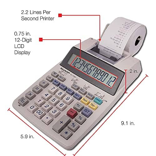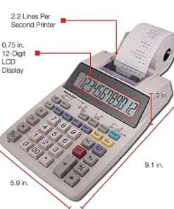 Calculadora de impresión Sharp SH-EL1750V en color negro/rojo. Viene en una caja de color gris. Incluye funciones de cálculo de costo/venta/margen, cálculo de impuestos, y mucho más. El adaptador de corriente y los rollos de papel son opcionales y no están incluidos.