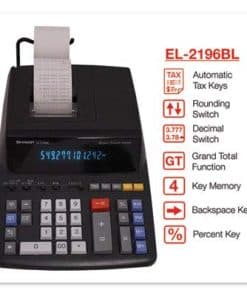 La Sharp EL-2196BL es una calculadora de sobremesa de 12 dígitos alimentada por CA con impresora de dos colores. Características: Pantalla grande: pantalla fluorescente azul de 12 dígitos (12.0 mm) con puntuación. Impresión rápida y nítida de dos colores: imprime a aproximadamente 3.5 líneas/seg. en 2 colores (números positivos en negro, números negativos en rojo) en rollos estándar de papel. Teclas de impuestos: permiten cálculos de impuestos fáciles. Tecla de aumento: utilizada para realizar aumentos, cálculos de costo/venta/margen, cambios porcentuales y descuentos automáticos. Teclas de tasa: permiten funciones de conversión simples. Tecla de total general: añade el total general de varias operaciones como los precios totales veces las unidades en una factura. Otras características incluyen decimales flotantes (F) o fijos (6,3,2,1,0), modos de suma y constante, recuento de ítems, configuraciones de impresión y no impresión, y selector de redondeo hacia arriba/abajo. La conveniente alimentación CA significa que no se agotan las pilas. Contenido del paquete: Calculadora, cable de alimentación/adaptador de CA, rodillo de tinta de dos colores, rollo de papel, instrucciones, información de garantía. Velocidad de impresión rápida que agiliza el flujo de trabajo. Cálculos de precios e impuestos fáciles. Muestra e imprime fecha y hora.