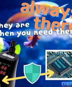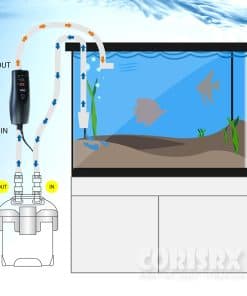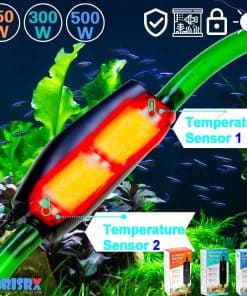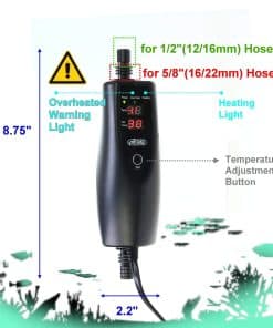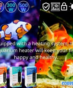Tamaño aplicado: 5/8″(16/22mm), 1/2″(12/16mm), se puede aplicar a ambos tamaños. Características: 1. Vidrio de pulverización térmica, acelera el proceso de calentamiento, mayor eficiencia. 2. Diseño externo, fácil de instalar y no ocupa espacio en el tanque. 3. Dos sensores para examinar las temperaturas de entrada y salida del agua. 4. Sistema de seguridad de apagado automático cuando – La temperatura es superior a 36 – La temperatura es 3 más alta que la temperatura de ajuste – La diferencia entre los dos sensores es superior a 5. Cómo usarlo: 1. Conecte la entrada de agua en la parte inferior del calentador y la salida de agua en la parte superior del calentador. 2. Presione el botón para ajustar la temperatura. 3. Por favor, desenchufe el calentador antes de poner la mano dentro del tanque. 4. El calentador externo es solo para uso en interiores y solo se usa fuera del tanque. 5. La garantía solo se aplica al calentador, no a los animales, plantas o equipos del tanque. Precisión 1 C / Rango de temperatura 20~35 C.