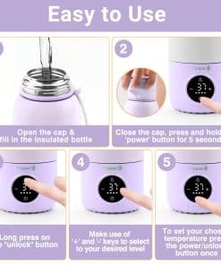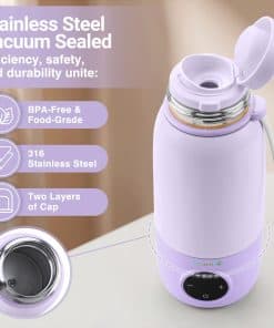 Aprecie la salud de su bebé con nuestro calentador de agua para biberones o calentador de biberones de leche materna y su potente batería de 5000mAh, que mantiene una temperatura constante durante 12 horas para preservar los nutrientes esenciales. La seguridad es de suma importancia gracias a sus mecanismos únicos, dos capas de tapa y características de bloqueo por defecto. La limpieza de nuestro calentador de biberones portátil para leche materna o dispensador de agua tibia para biberones es sencilla, ya que nuestros materiales de acero inoxidable 316 y de grado alimenticio mantienen los más altos estándares de higiene.