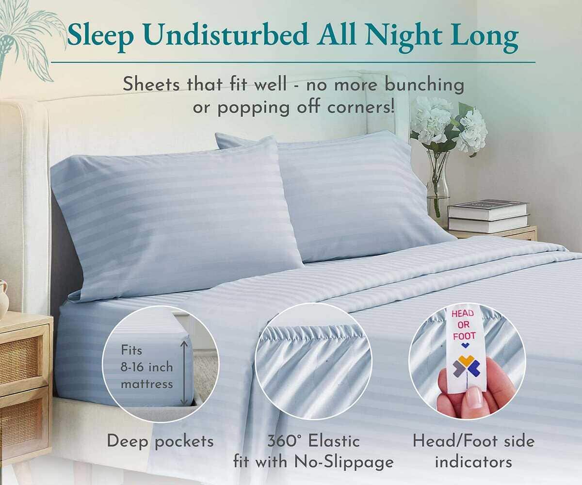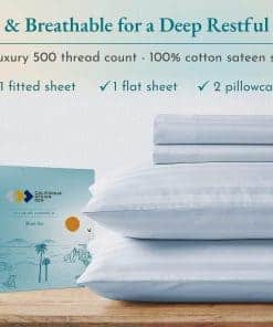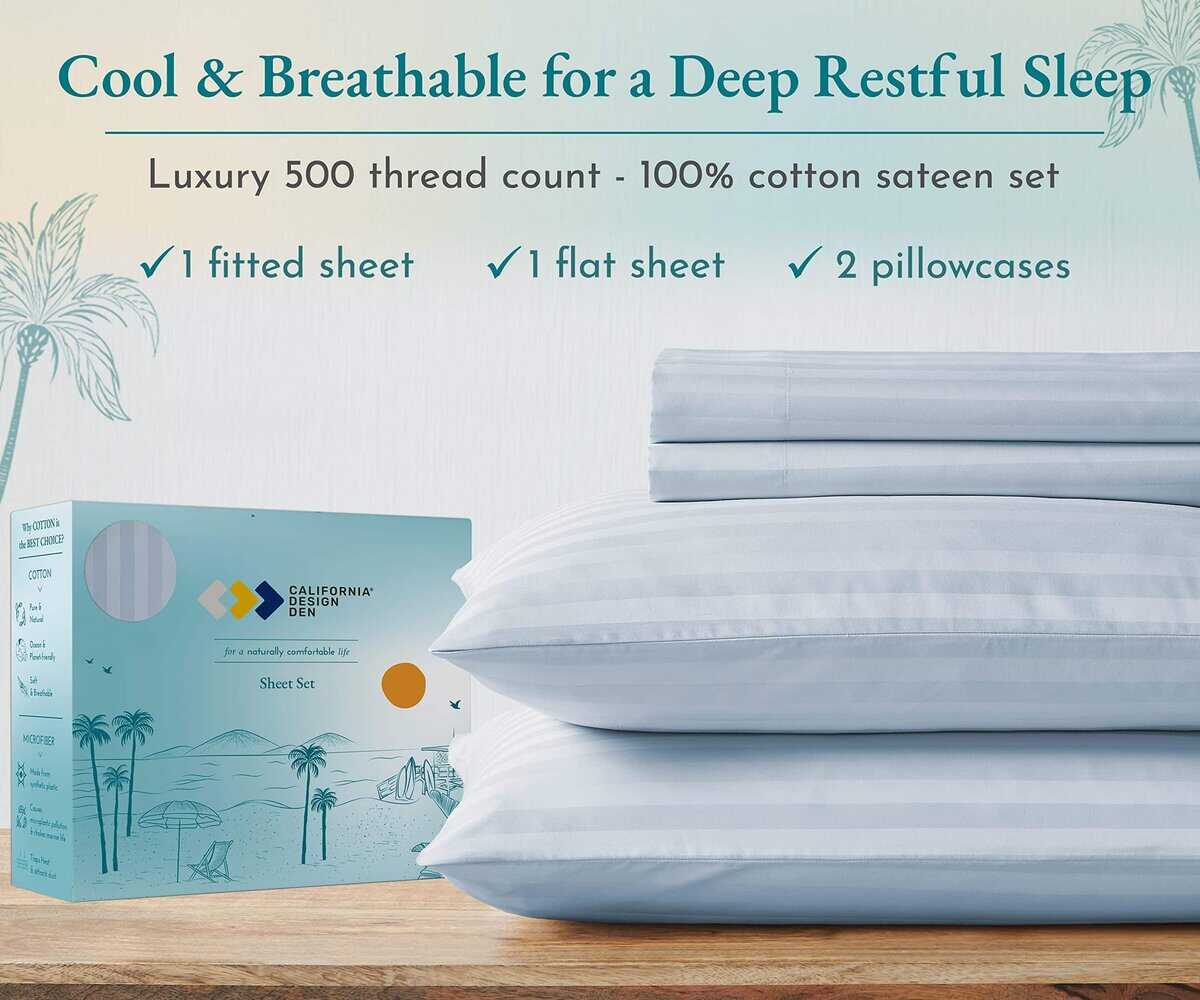 California Design Den – Juego de sábanas Queen de algodón suave 100% algodón Sábanas refrigerantes con bolsillos profundos Ajuste elástico, 500 hilos, juego de 4 piezas, calidad de hotel, sábanas a rayas Damask para cama (Azul Claro). Listo para dormir en lujo! Transforma tu experiencia de sueño con nuestras lujosas sábanas de 500 hilos, hechas de satén de algodón 100%! Experimenta la máxima suavidad, comodidad y transpirabilidad que te mereces, para una buena noche de sueño que te deja sintiéndote renovado y lleno de energía por la mañana. Actualiza tu dormitorio con nuestro juego de sábanas queen de 500 hilos para una experiencia de sueño lujosa. ¡Confort duradero certificado: invertir en nuevas sábanas de cama es una gran decisión! Pero con tantas marcas haciendo afirmaciones no verificables de algodón egipcio, puede ser abrumador saber en quién confiar. ¡Nuestras sábanas de lujo de 500 hilos certificadas de forma independiente garantizan una inversión inteligente! Duraderas, cómodas y hechas para durar años, puedes dormir tranquilo sabiendo que tomaste la decisión correcta. Consigue el ajuste perfecto con todas las sábanas de algodón para cama queen. ¡Experimenta lo último en confort y salud! ¡Estas sábanas ligeras y aireadas eliminan la humedad y promueven un sueño profundo y reparador! Perfectas para personas que duermen calientes, ¡son naturalmente frescas y amigables con la piel! Usamos algodón de fibra extra larga, lo que las hace suaves y mantecosas al tacto. Construidas para durar, ¡estas sábanas lujosas inspiradas en Italia te dejarán sintiéndote renovado y rejuvenecido todas las mañanas! Actualiza tu ropa de cama con nuestras sábanas de cama de algodón queen para un sueño cómodo y elegante. ¡Cansado de sábanas mal ajustadas! ¡Nuestra sábana ajustable está diseñada para adaptarse a colchones de hasta 16 pulgadas de profundidad! ¡No más montones o esquinas que se desprenden! Con un elástico duradero en toda la circunferencia y un indicador de cabeza/pie para hacer la cama fácilmente, ¡amarás la comodidad! ¡Nuestro juego de tamaño queen de 4 piezas incluye tejido sin manchas, sin decoloración, sin agujeros y sin bolitas! ¡Obtendrás el confort que te mereces durante años! ¡Obtén el ajuste perfecto con nuestras sábanas de cama! ¡Te prometemos que amarás estas sábanas! ¡El Wall Street Journal confirma que «las sábanas de algodón de California Design Den son tan suaves y bien hechas como otras sábanas de algodón que cuestan más de tres veces su precio»! Nuestras sábanas son lavables a máquina, fáciles de mantener y certificadas por Oeko-Tex para tu seguridad. ¡Además, si no estás satisfecho, puedes devolverlas dentro de 30 días según las pautas! Obtén sábanas de cama queen de bolsillo profundo para una experiencia de sueño lujosa.