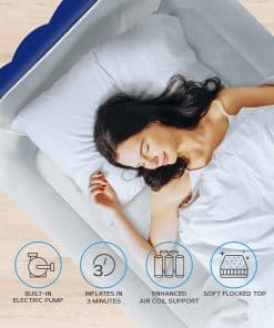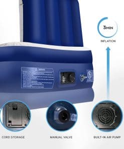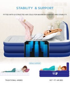 1. Cabecera Integrada: La cabecera incorporada brinda a tu cama de aire un apoyo extra para la espalda al estar recostado, y su tope para almohadas evita que las almohadas se caigan mientras duermes. El colchón de aire Get Fit te hace sentir como si estuvieras durmiendo en un colchón tradicional, olvidarás que estás en un colchón de aire. Su superficie suave y aterciopelada no emite ningún sonido chirriante al moverte, así que no perturbará el sueño de tus hijos. Sus 21 bobinas de aire individuales ayudan a distribuir el peso y proporcionan una superficie equilibrada.