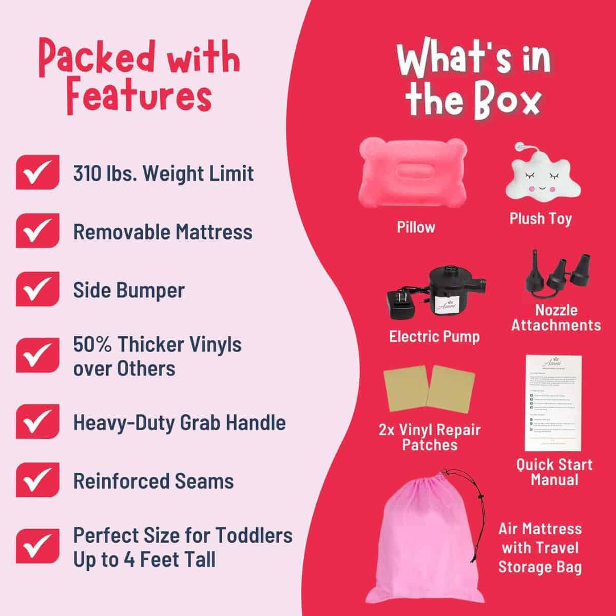 El set viene con una bomba, almohada, kit de parches y un juguete de peluche ¡Obtén tu colchón de aire para niños con la confianza de un!