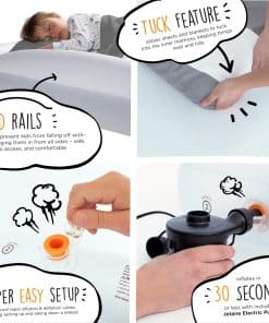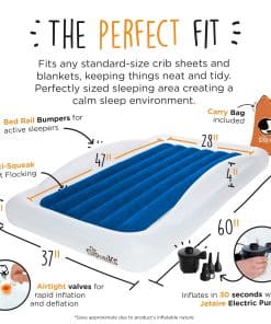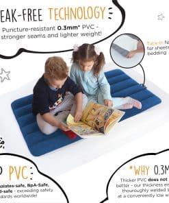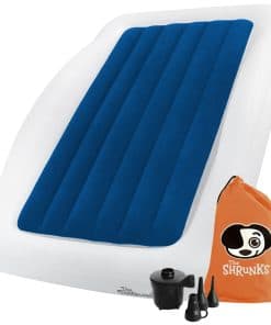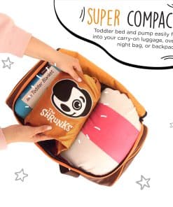 1. LA ORIGINAL y PREMIADA Cama de Viaje para Niños – The Shrunks es el FABRICANTE ORIGINAL de la Cama de Viaje para Niños, con numerosos premios de diseño. AMADO POR LOS CLIENTES: La Cama de Viaje para Niños de The Shrunks se ha vendido en nuestra tienda durante más de 10 años. La cama de piso para niños de The Shrunks ha sido una favorita de los clientes desde 2007. 2. SIN RUIDOS MOLESTOS y CÓMODA- Squeak, squeak, squeak toda la noche se elimina, gracias al suave flocado en la parte superior. ¡EL AJUSTE PERFECTO! La cama de The Shrunks es del tamaño y ajuste adecuados para que los niños se sientan cómodos durmiendo en una cama de transición que es del tamaño adecuado, para que se sientan SEGURGS y PROTEGIDOS – una cama diseñada para ellos, no para su hermano o hermana mayor. Más grande no significa mejor. Ajuste el aire para personalizar la cama para la comodidad de cada niño. 3. BARANDILLAS DE SEGURIDAD y CARA�aLLO – Los niños se sienten seguros, acogedores y como en casa, gracias al diseño único de la cama de aire portátil: cualquier sábana de cuna y manta de tamaño estándar se pueden guardar en el colchón de aire interno. Nuestros parachoques de seguridad con marca registrada ayudan a evitar que su hijo se caiga de la cama – la cama de piso para niños está diseñada cerca del suelo, para una seguridad completa. Nuestro diseño de una sola pieza se dobla fácilmente para guardarlo y viajar. 4. HERMÉTICO-DURADERO-RÁPIDO – Construido con los materiales más seguros, las Camas de Viaje The Shrunks están libres de Ftalatos, BpA y Plomo. El diseño premiado está construido para durar con materiales resistentes a los pinchazos, costuras reforzadas y válvulas AirTight. Incluye una bolsa de transporte conveniente, kit de reparación y la compacta Bomba Eléctrica Jetaire. Pequeña y compacta, esta potente bomba hace el trabajo rápidamente. Tiempo aproximado de inflado: 30 segundos. Tamaño inflado: 60 x 37 x 9 (pulgadas), 152 x 94 x 23 (cm). 5. LA MEJOR FIESTA DE PIJAMAS – La Cama de Viaje para Niños es perfecta para fiestas de pijamas, viajes de vacaciones, hoteles, casa de los abuelos y para niños que hacen la transición a una cama grande. Los niños se sienten seguros, acogedores y como en casa – gracias al diseño patentado de la cama de aire portátil de The Shrunks. Perfecta para viajes en avión, la cama de viaje de The Shrunks se pliega plana para caber en una mochila, equipaje de mano o bolso de noche. No tiene asas voluminosas ni bombas incorporadas que agreguen tamaño o peso.