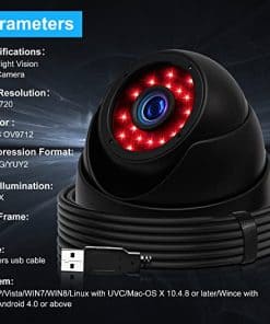 ELP-USB100W05MT-DL36 es una cámara USB con LED IR día y noche y también con carcasa de cúpula completamente resistente para uso de vigilancia de video personal en casa o seguridad industrial. Esta cámara USB Domo ya se utiliza ampliamente en casa y también en la sala de cajeros automáticos del banco para conectarse a la PC del cajero automático para seguridad. Especificación: Sensor: OV9712 Formato de imagen ‘YUY2 y MJPEG opcional’ / Protocolo USB USB2.0 HS / FS Exposición automática AEC Soporte / Balance de blancos automático AEB Soporte Rendimiento: 1280 (H) x 720 (V) píxeles MJPEG 30 fps YUY2 10 fps 960 (H) x 720 (V) píxeles MJPEG 30 fps YUY2 15 fps 800 (H) x 600 (V) píxeles MJPEG 30 fps YUY2 20 fps 640 (H) x 480 (V) píxeles MJPEG 30 fps YUY2 30 fps Parámetros ajustables Brillo / Contraste / Saturación de color / Definición / Gama / WB con IR Cut e IR board para visión nocturna IR. Soporte de SO ‘WinXP / Vista / WIN7 / WIN8 / Linux con UVC / Mac-OS X 10.4.8 o posterior / Wince con UVC / Android 4.0 o superior’