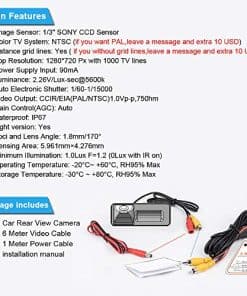 1280 720 píxeles 1000 líneas de TV 170 grados de rango visible, funciona muy bien con el punto ciego; Incluye: 1 x Cámara de coche CCD, 1 x manual de usuario, 1 x cable de vídeo de 6 m, 1 x cable de alimentación.
