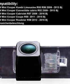 Estimado cliente, ¡por favor asegúrese de revisar el tamaño y la apariencia de la cámara antes de realizar un pedido, para asegurarse de que pueda adaptarse al tamaño y apariencia de la lámpara de matrícula de su automóvil! Debido a que el mismo modelo de automóvil en diferentes países puede tener algunas diferencias, por favor verifique el tamaño de la cámara y compare la instalación de su automóvil cuidadosamente para evitar errores. Este producto podría adaptarse a todos los modelos mencionados anteriormente como se espera: Para BMW E53 E46 318 3er 316i 2003bj E46 310 330 2005Bj; BMW Mini Cooper One Cabriolet S R50 R52 R53 W10 W11 2002/07-09/11; Serie 1 de BMW E88 Coupe Cabrio a partir de 2007; Serie 2 de BMW F22 F23 F45 F46; Serie 3 de BMW E46 M3 CSL E90 E91 E92 E93 E93 a partir de 2005; Serie 3 de BMW F80 F81 F30 F31 F34; Serie 4 de BMW F82 F83 M4 F32 F33 F36; Serie 5 de BMW E39 E60 E60N E61 E61N de 1995 a 2004; Serie 5 de BMW GT G30G31 G38 F07 F10 F11 F11N F18; Serie 7 de BMW E65 E66 E67 Limousine de 2005 a 2008; BMW X1 E84 F48 BMW X3 F25 BMW X4 F26; BMW X5 E70 E70N F85 F15; BMW X6 E71 E72 F16 F86 – Sensor de imagen: CCD en color de 1/3 de pulgada – Ángulo de visión: 170 grados – Sistema de TV: estándar NTSC y si necesita PAL, por favor deje un mensaje – Píxeles efectivos: 1280 720 píxeles – Resolución: 1000 líneas de TV – Fuente de alimentación: DC 12V – Resistente al agua: IP68 – Temperatura de trabajo: -40 ~ 70 / -40 ~ 158 Contenido del paquete 1 x Cámara trasera para coche 1 x Cable de alimentación (1.5 m/4.9 pies) 1 x Cable AV (6 m/19 pies) 1 x Manual del usuario