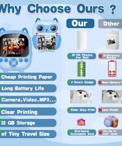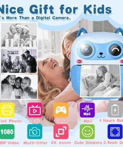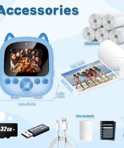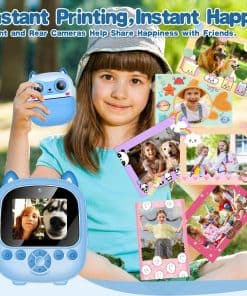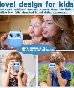 2. Cámara de Niños de Instantánea Lindo: Esta cámara para niños puede imprimir fotos en blanco y negro de inmediato, las fotos a color se almacenan en la tarjeta SD, puedes volver a imprimirlas más tarde. Esta cámara instantánea está equipada con 1 rollo de papel de impresión, adicionalmente, hay una opción para 5 rollos adicionales de papel de impresión, que pueden imprimir alrededor de 280 fotos. El papel de impresión es impermeable. Sus hijos pueden capturar momentos mágicos a través de imágenes lúdicas que pueden estimular su imaginación y dar vida vívida a sus sueños. 3. Cámara de Niños Multi-funcional: Esta mini cámara instantánea cuenta con impresión instantánea y una impresora de fotos, 22 tipos de adhesivos adorables, 10 filtros, doble lente, video 1080P, pantalla IPS de 2.4 pulgadas, zoom digital de 6x, lapso de tiempo, disparo en ráfaga, juegos y reproducción de mp3. Esta cámara atiende a los caprichos variados de la infancia, convirtiéndose en un socio apreciado en su alegre viaje de crecimiento. Es un tesoro de momentos encantadores, enriqueciendo las vidas de usted y su familia de la manera más vibrante posible. 4. Impresión Térmica Segura: Esta cámara de juguete para niños utiliza tecnología de impresión térmica sin tinta. Los materiales de la cámara de película instantánea para niñas son seguros y respetuosos con el medio ambiente. Utiliza plástico de alta calidad sin carbono. No tiene olor ni es tóxico. Es más seguro y cómodo para la piel de los niños. La carcasa a prueba de golpes proporciona una protección efectiva contra caídas. Sus hijos disfrutarán de un entorno de juego saludable y no tóxico que apoya su bienestar, lo que brinda tranquilidad a los padres. 5. Portátil y Batería Potente: ¡La cámara genial para niños viene con un cable de datos Tipo-C, lo que significa que puede cargarlo muy rápido! Una vez que esté cargado por completo, ¡puede seguir tomando fotos durante aproximadamente 8 horas seguidas o grabar videos durante 4 horas impresionantes! ¡Y hay una tarjeta micro SD de 32GB que puede almacenar miles de fotos a color hermosas! Sus pequeños podrán aferrarse a cada maravillosa instantánea contigo, asegurándose de que no se escape ni un solo recuerdo querido de sus pequeñas manos.