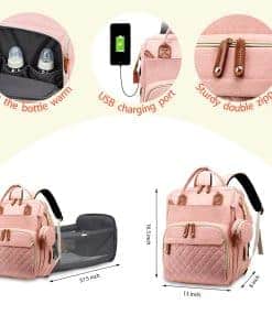 Mochila de pañales con estación de cambio. No más preocupaciones por que el bebé toque superficies sucias al cambiar pañales. La mochila de pañales se convierte fácilmente en una estación de cambio, muy conveniente si estás fuera de casa y no tienes accesorios para bebés. El cambiador es suave y cómodo. Esta mochila de pañales es un artículo esencial para bebés. Un regalo ideal para el baby shower. Con puerto de carga USB y gran capacidad, la mochila de pañales tiene una gran capacidad (Dimensiones: 13″L x 8″W x 16.5″H), con 18 bolsillos internos y externos. Puede contener todos los artículos esenciales diarios de tu recién nacido, como pañales, baberos, biberones y otros productos de higiene. El lado izquierdo es un puerto de carga USB donde puedes usar un banco de energía y cargar tus dispositivos electrónicos. Hecha de tela oxford 900D duradera e impermeable (más resistente que una mochila de bebé de poliéster liso, mejor resistencia a la deformación y a las roturas). Impermeable, fácil de limpiar, el exterior de la mochila es de tela impermeable para que no te preocupes por mojarte en días de lluvia. Tres bolsillos térmicos mantienen los biberones calientes. La mochila para mamás viajeras también tiene un bolsillo separado e impermeable para artículos mojados. Correas de hombro anchas con dos ganchos. El acolchado ventilado de múltiples paneles grueso y suave te brinda el máximo soporte lumbar. Las anchas correas de hombro transpirables y ajustables alivian el estrés de los hombros. La parte trasera tiene dos ganchos metálicos para colgar la mochila en la parte trasera de un cochecito. Todo el diseño está pensado para ser tu compañera de viaje perfecta. No solo es una mochila de mamá. Esta mochila de pañales puede usarse como mochila, bolso de mano o colgarse en el cochecito. Un diseño elegante y adecuado para muchas ocasiones, como ir de compras, viajar, etc. Además, su diseño práctico y unisex hace que esta mochila de pañales sea perfecta para viajar con tus niños y niñas. ¡Los papás están felices de ser vistos en público con ella cuando están de guardia como papás! ¡Un regalo ideal para recién nacidos y para el registro de bebés en el baby shower!
