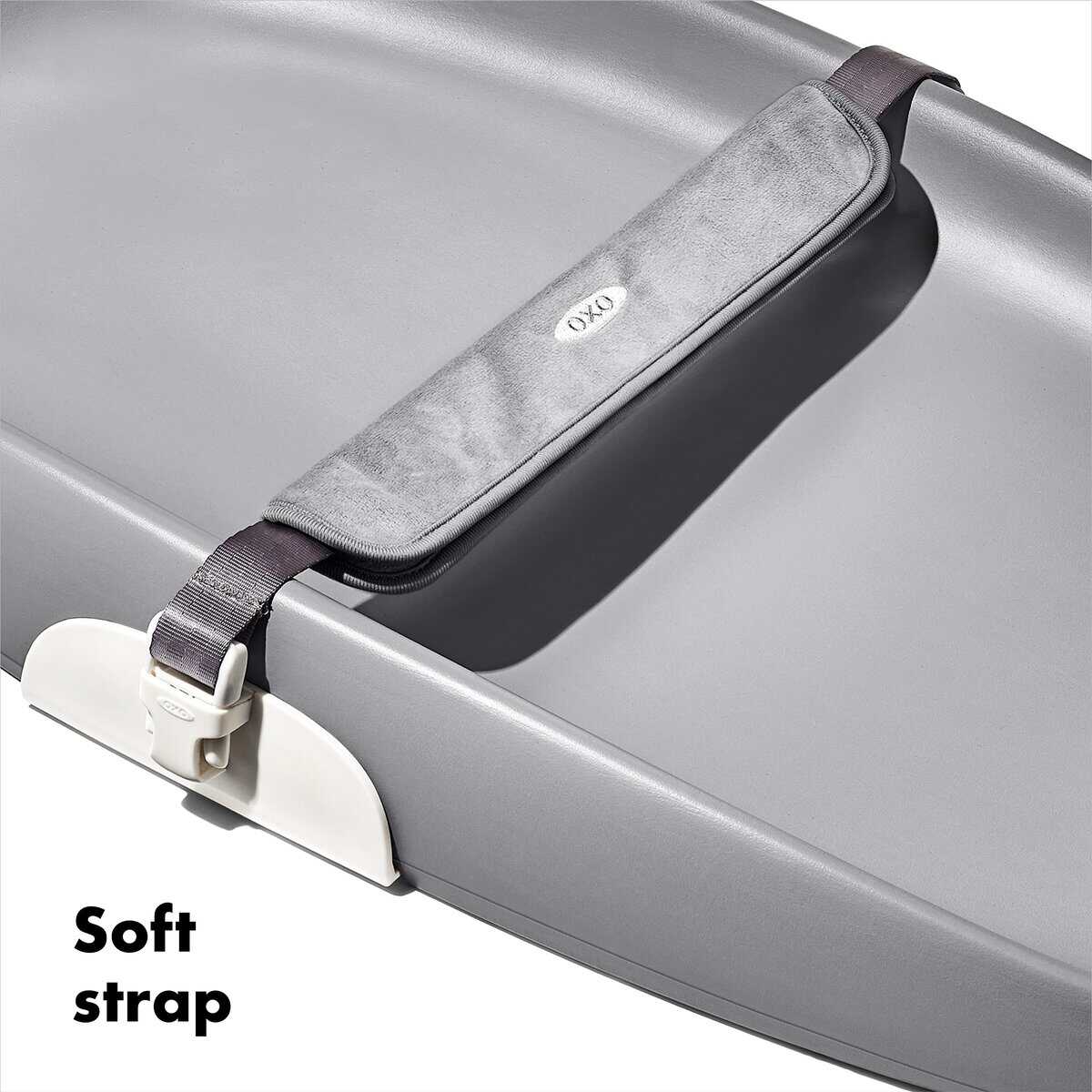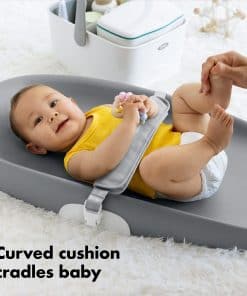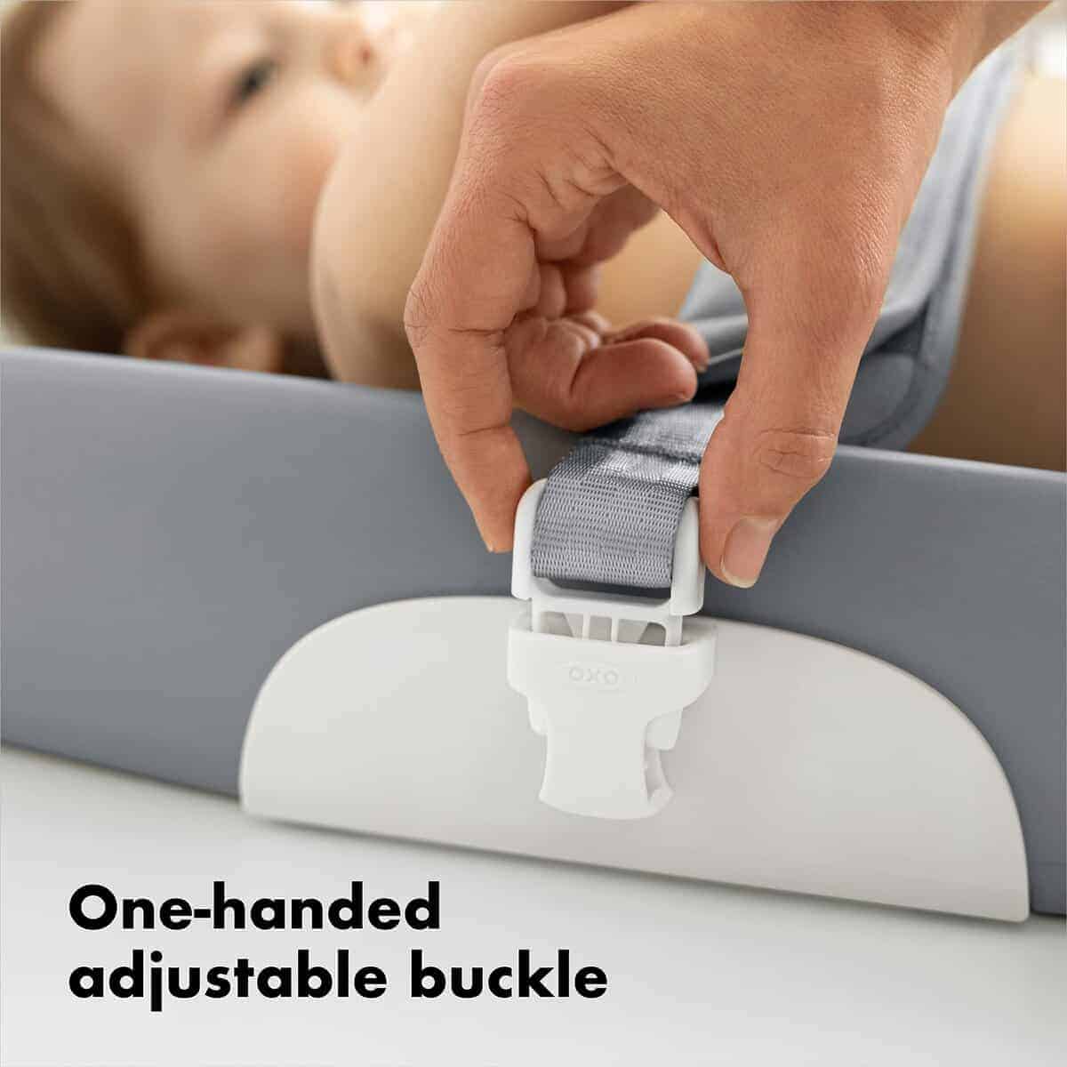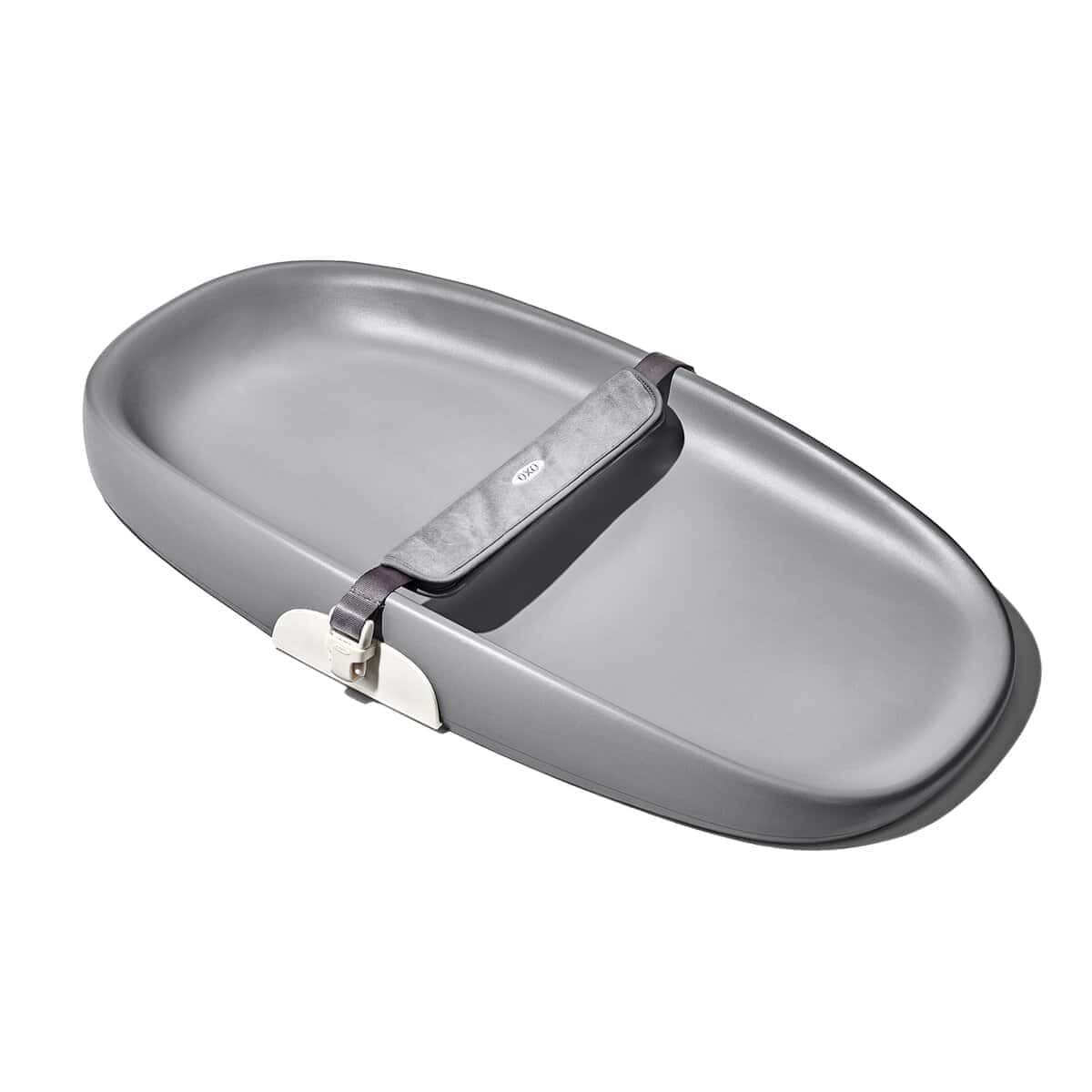 Nunca se puede estar seguro cuándo ocurrirá el próximo cambio de pañal. Con el Cambiador OXO Tot, nunca te quedarás sin nada. El cojín de tamaño generoso y cómodo se puede utilizar fácilmente con cualquier mesa o cómoda para cambios de pañal. Incluye una hebilla de un solo mano para que puedas mantener una mano en tu bebé inquieto durante los cambios. La correa de la hebilla es ajustable, por lo que puede crecer con tu hijo. El cojín suave y libre de PVC proporciona un lugar cómodo para que el bebé se acueste, mientras que el diseño curvo acuna al bebé para una protección adicional. Además, el material de EVA y el diseño inclinado hacen que sea fácil de limpiar. Capacidad de peso de 30 lb.