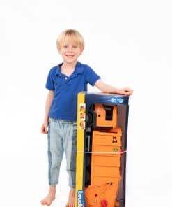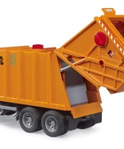 El MAN TGS es el vehículo perfecto para todo tipo de trabajos en sitios de construcción, despliegue de larga distancia y distribución local. Gracias a su diseño duradero, con potentes motores y una capacidad de carga superior a la media, este camión es el prototipo del vehículo frecuentemente descrito como «todoterreno» con muchas innovaciones a bordo. La cabina de dos tonos cuenta con puertas que se pueden abrir para proporcionar a cualquier figura de bworld un lugar de trabajo moderno. Todo el proceso de carga y descarga del camión de basura está controlado por un mecanismo giratorio único, con el cual se pueden vaciar dos contenedores de basura al mismo tiempo. Gracias a la consola portadora flexible, el mismo procedimiento también es posible para el contenedor de residuos. El proceso: los contenedores de basura se empujan en la consola portadora y los desechos se levantan y se vacían en la tolva de basura. Cuando la rueda se gira, se introduce en el mecanismo de prensado funcional, se comprimen y luego se transportan al bunkers de desechos. Este proceso se representa vívidamente a través de una ventana de visualización. La manija en la parte superior del bunkers de desechos se utiliza para vaciar los desechos. Al girar esta manija, los desechos se transportan hacia la parte trasera, pasando por la unidad de carga y descarga elevada, por medio de un tobogán de descarga. Dos pequeños contenedores de basura y neumáticos con dibujo completan el cuadro. El camión de basura MAN TGS se puede equipar con el set de contenedores de basura (3 contenedores pequeños, 1 contenedor grande) artículo núm.: 02607.