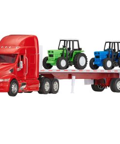 Camión de Juguete Modelo Diecast Wheel Master, Peterbilt 387 Rojo con Remolque Plano y 2 Tractores Agrícolas, Puertas que se Abren, Escala Interactiva 1:32
