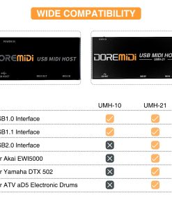 Host Box MIDI USB de Alta Velocidad, Soporta comandos MIDI SysEX y todos los mensajes y comandos MIDI estándar Host USB, 1 MIDI de entrada y 1 MIDI de salida Transmisión Estable MIDI Estándar de 16 Canales Mejor Compatibilidad: Este Host Box MIDI USB de alta velocidad tiene un estándar USB2.0 de alta velocidad, que tiene las características de una fuerte compatibilidad, una rápida velocidad de transmisión y una alta estabilidad. Compatible con todos los dispositivos USB MIDI con USB2.0/USB1.0/USB1.1. Combina Diferentes Dispositivos Midi: 1. Convierte la interfaz USB MIDI de un instrumento musical en un dispositivo de interfaz MIDI de 5 pines común. 2. Conecta dispositivos MIDI con 5 pines y dispositivos MIDI con interfaz USB-B. Diseño Metálico, Resistente y Duradero: Host Box MIDI utiliza una aleación de aluminio de alta resistencia y una interfaz MIDI de metal, más resistente al desgaste y duradero. Almohadilla de Pie de Silicona, Absorción de Choque Antideslizante: Diseñado con pies de silicona, para lograr el efecto de antideslizante y absorción de choque. Apariencia de Alta Gama Cepillada y Escarchada: Uso de una combinación de cepillado metálico y escarchado, más elegante. Cómo Usar: 1. Utilizar alimentación USB de 5V DC para alimentar el producto. 2. Conectar el USB del instrumento al HOST USB del producto. 3. El MIDI OUT del producto se conecta al MIDI IN del instrumento. 4. El MIDI IN del producto se conecta al MIDI OUT del instrumento. Contenido del Paquete: 1 x Host Box MIDI (UMH-20) 1 x Cable de Carga Servicio Posventa: Si tiene alguna pregunta durante el uso, contáctenos sin dudarlo, haremos todo lo posible para resolverlo.