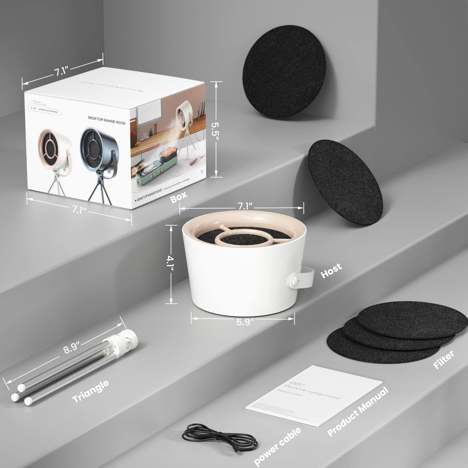 1. Potente Potencia de Succión La mini campana extractora está hecha de materiales de alta calidad ABS, removible y fácil de limpiar. Tiene un motor potente y una potencia de succión de 1200Pa, que absorbe eficazmente los olores y garantiza aire fresco en la cocina. Adopta algodón de filtro de carbón activado, que tiene una fuerte adsorción y puede filtrar eficientemente el humo de aceite. El algodón de filtro se puede utilizar de 4 a 5 veces, cada máquina viene equipada con 5 piezas de algodón de filtro. 2. PURIFICADOR DE AIRE DE COCINA PORTÁTIL: Purificador de aire de cocina portátil diseñado para uso en interiores, perfecto para hogares sin campanas extractoras, pequeños apartamentos, autocaravanas, dormitorios, estufas eléctricas e de inducción, fiestas de barbacoa en interiores, reuniones de olla caliente y disfrutar de los sabores auténticos de la barbacoa coreana y la barbacoa japonesa. 3. Un botón de inicio: La campana de cocina de sobremesa es fácil de controlar. Presione el botón para elegir el ventilador de escape de 3 velocidades, opere con una rápida respuesta. 4. Ahorro de espacio: Campana de cocina portátil, ventilador de escape de cocina, campana extractora, ventilador de escape para cocinar, campana de ventilación con diseño portátil, pequeño y ligero, los soportes y la campana extractora son desmontables, almacenamiento conveniente, ideal para apartamentos. 5. Operación silenciosa: Campana de escape de sobremesa, ventilador de escape portátil para cocina, campana de estufa, campana de cocina, con bajo ruido, menos de 6.5 Sones como máximo en la velocidad más alta. No te preocupes de que interrumpirá la comida, disfruta de la barbacoa y la cocina.