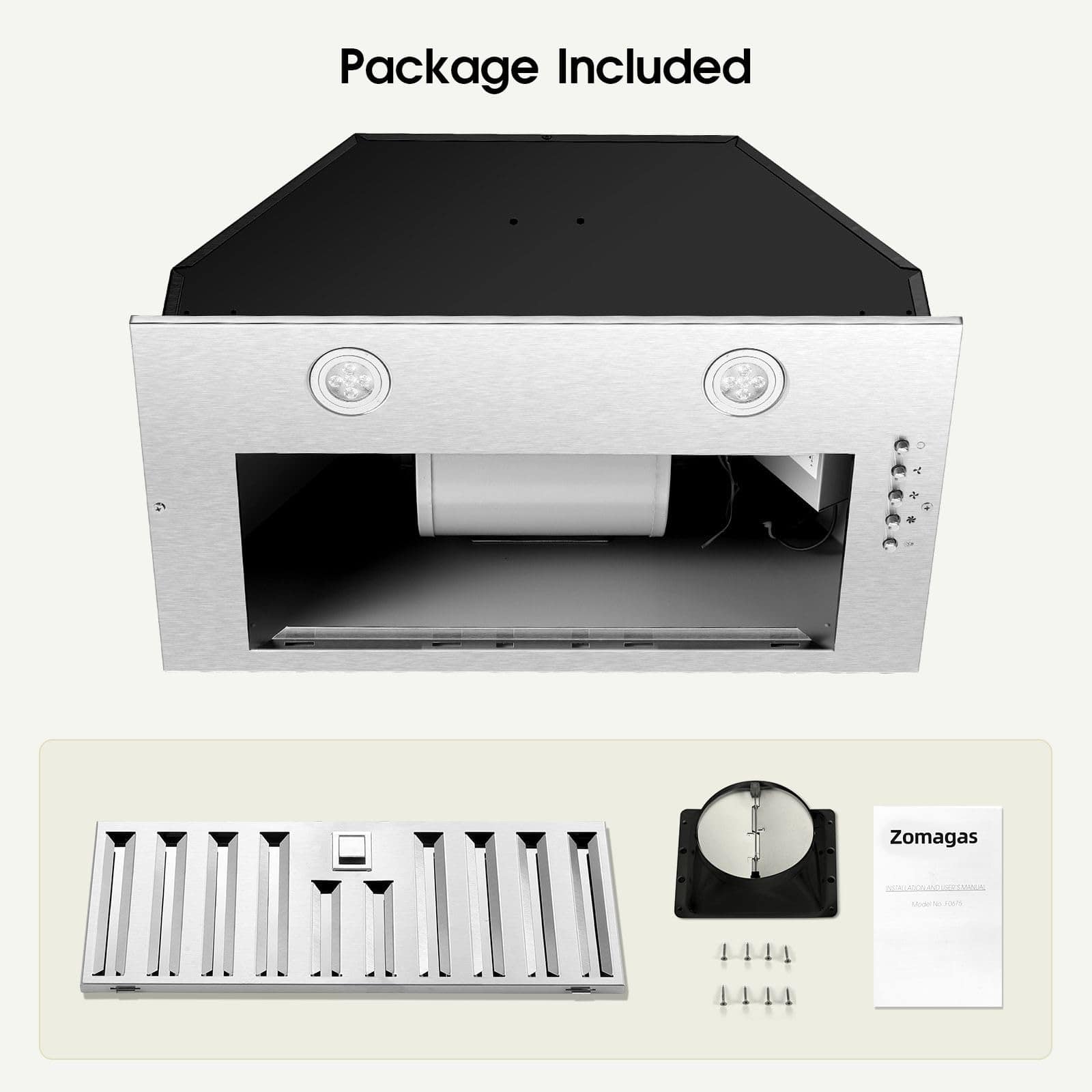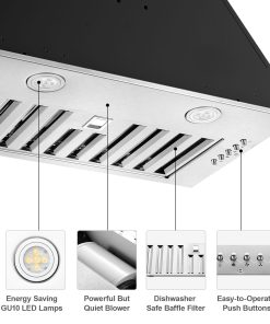 La campana extractora integrada de 20 pulgadas cuenta con un potente sistema de soplador y 3 ventiladores de diferentes velocidades, lo que puede hacer que su campana extractora de 20 pulgadas alcance una potencia de succión de 600CFM, eliminando eficientemente grandes cantidades de humo y olores a cocinar en la cocina. La campana extractora de 20 pulgadas viene con un duradero y fácil filtro de grasa de acero inoxidable limpio que se puede lavar en el lavaplatos y es fácil de quitar. Esta campana extractora específica atrapa la grasa y el aceite de cocción con facilidad, reduciendo la propagación de olores en su cocina. El diseño compacto de la campana extractora se adapta a espacios más pequeños mientras ofrece un rendimiento eficiente. El panel del filtro está hecho de acero inoxidable cepillado premium para soportar altas temperaturas, grasa, aceite y vapor. La campana extractora integrada cubre una pequeña área para una fácil limpieza y se adapta a una variedad de diseños de cocina. La campana tiene 2 lámparas LED blancas suaves de 2W, lo que significa que puede cambiar el color y la potencia de la luz para adaptarse a sus necesidades en cualquier ferretería local. La campana de 20 pulgadas ahorra energía en su cocina mientras emite suficiente luz. Dos opciones para la ventilación de la cocina, una para campanas extractoras sin ductos con filtros de carbón (se venden por separado Parte CFBD065), otra para campanas extractoras con ductos. Dos modos de ventilación para su personalización satisfacen sus necesidades de cocción.