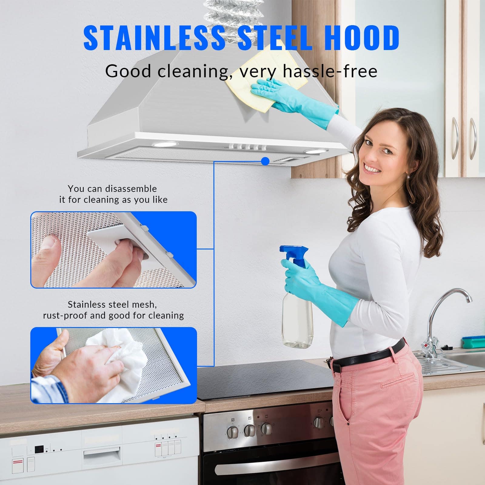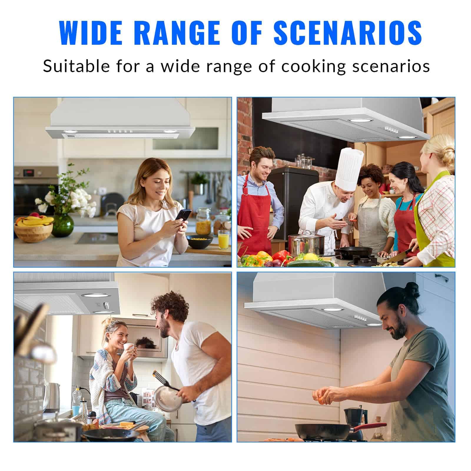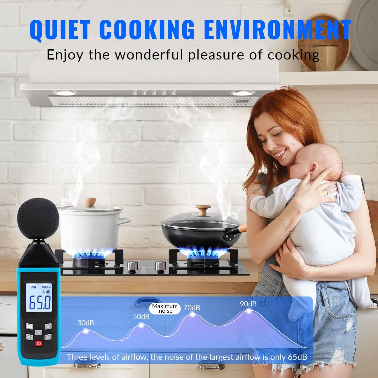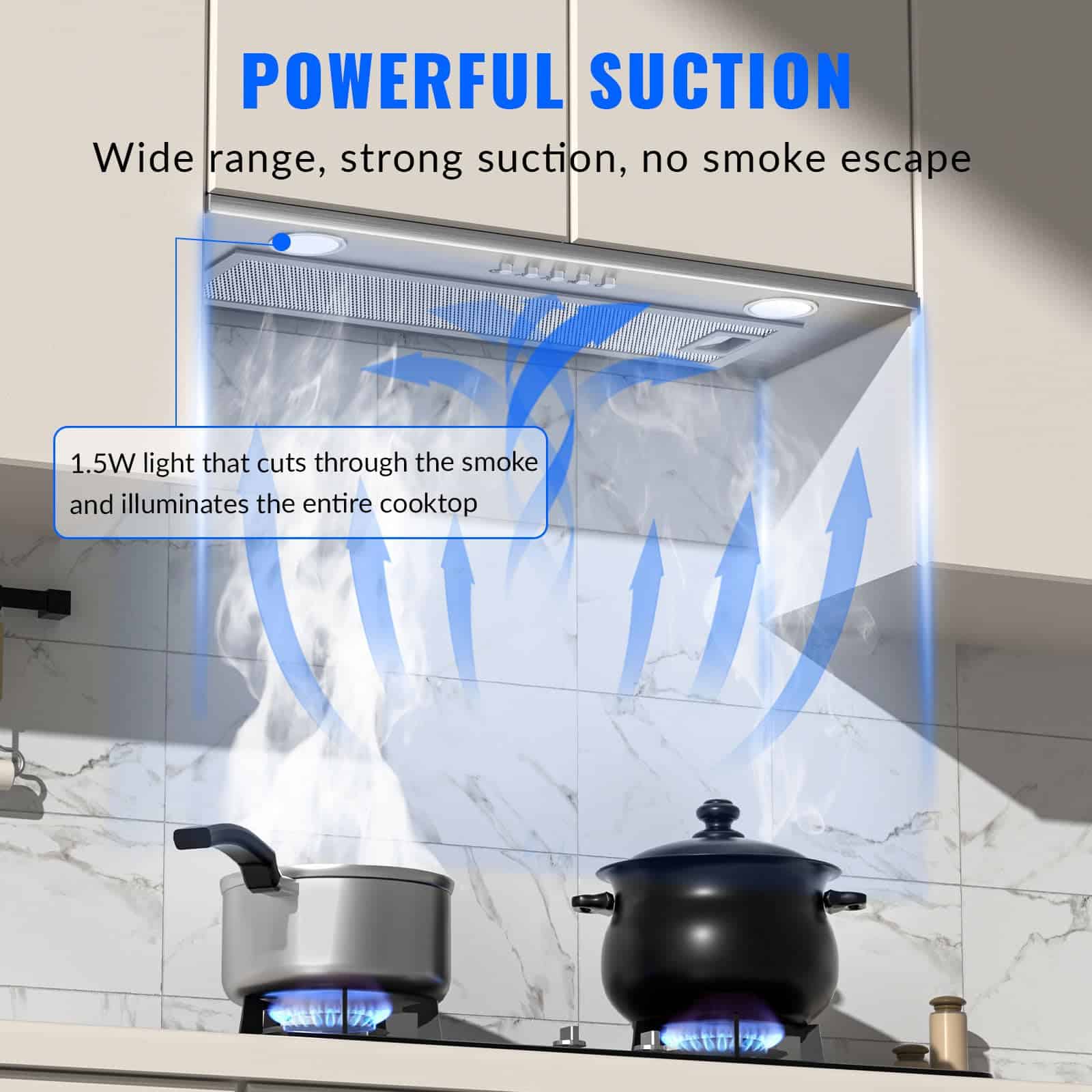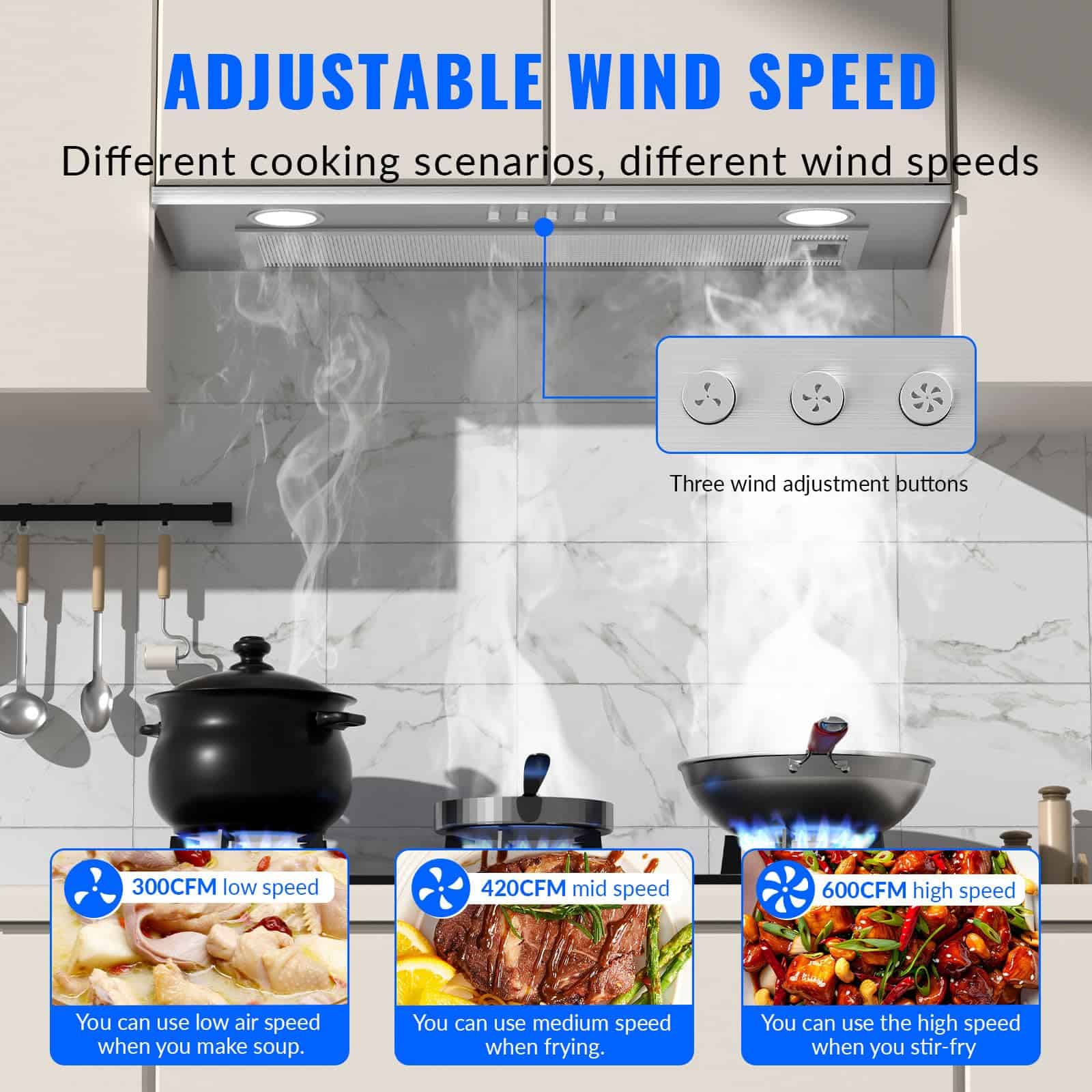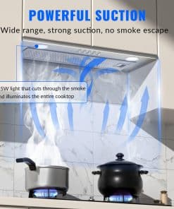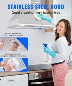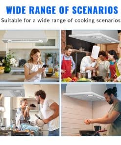 2. Campana Extractora Incorporada – Construida con acero inoxidable 430 duradero, nuestra campana de cocina incorporada de acero inoxidable garantiza resistencia y longevidad. Resistente al óxido y la corrosión, es muy fácil de limpiar. El potente motor galvanizado tiene una velocidad máxima de 600CFM, eliminando rápidamente humo y grasa de aceite de cocina de tu aire de cocina.