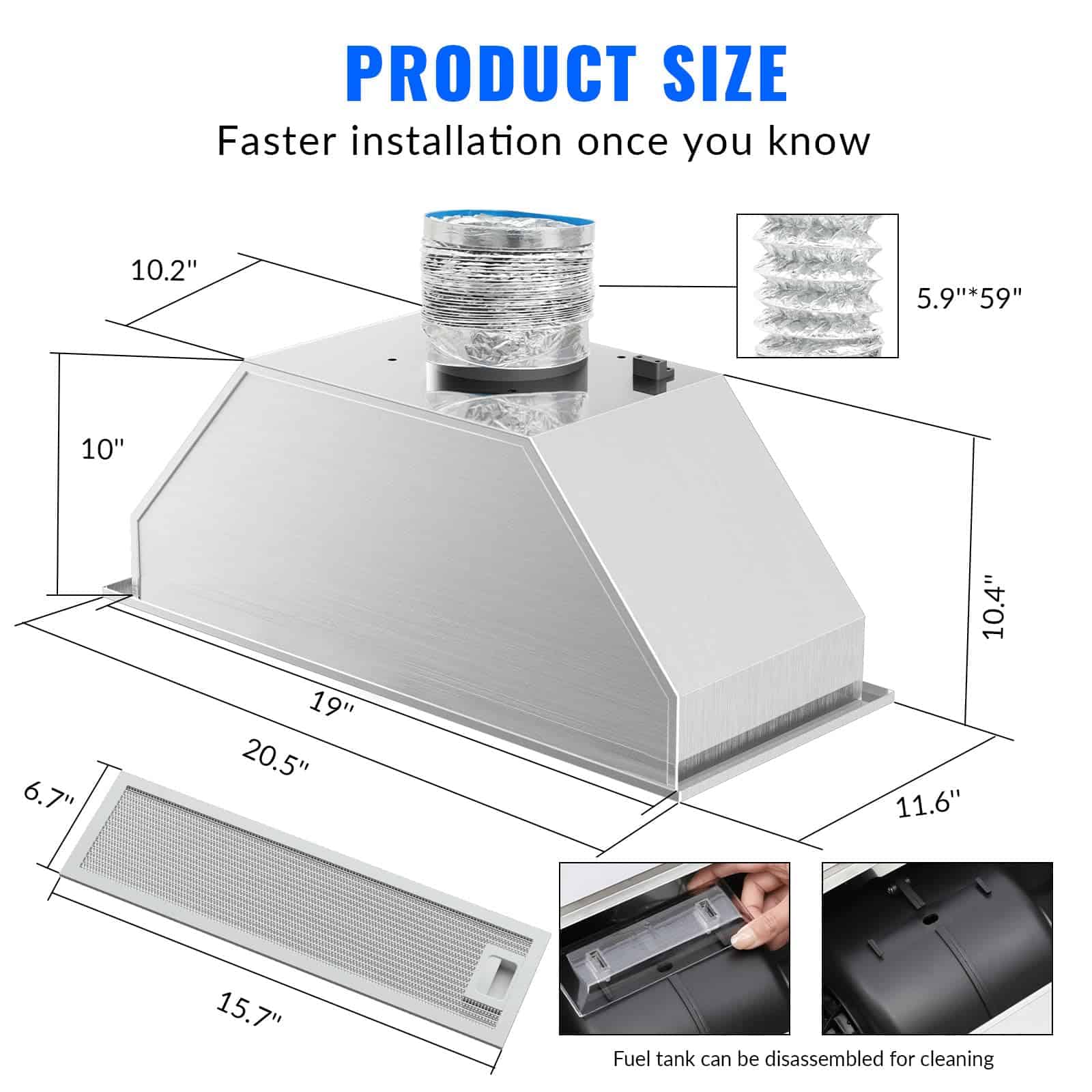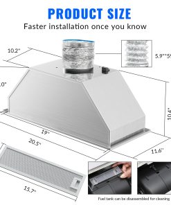 1. Tamaño del Producto – Eleva el aspecto de tu cocina con nuestra elegante campana extractora. Con dimensiones de 20.5 pulgadas (W) x 11.6 pulgadas (D) x 10.4 pulgadas (H) y especificaciones eléctricas de 120V/60Hz con un enchufe de 3 clavijas, esta campana extractora agrega un toque de lujo a cualquier remodelación de cocina.
