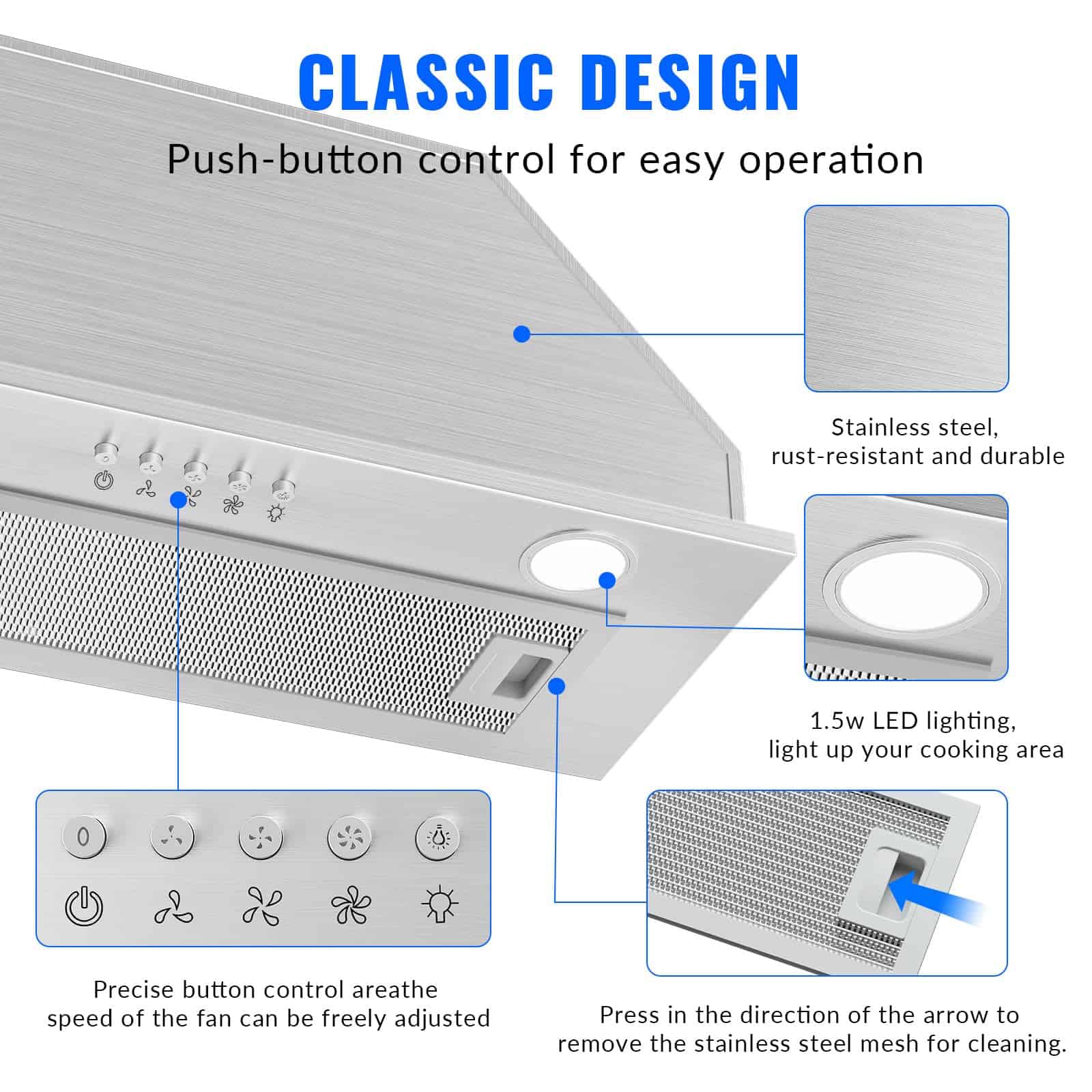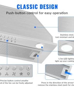5. Panel de Operación Sencillo – Con controles de botón, nuestra campana extractora incorporada hace que la operación sea muy sencilla. Simplemente selecciona el modo deseado con facilidad. Con ajustes de 3 velocidades, puedes cambiar sin esfuerzo entre velocidades de ventilador baja, media y alta para satisfacer diversas necesidades de cocción.