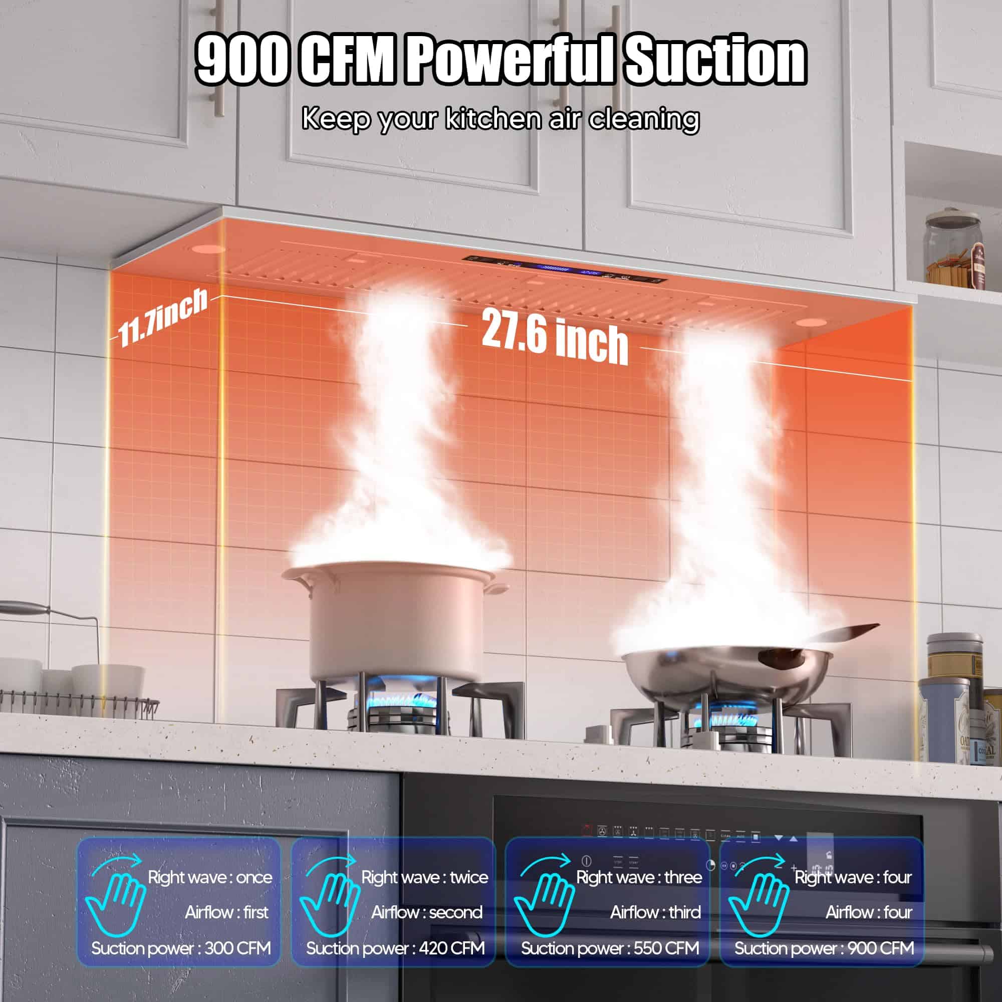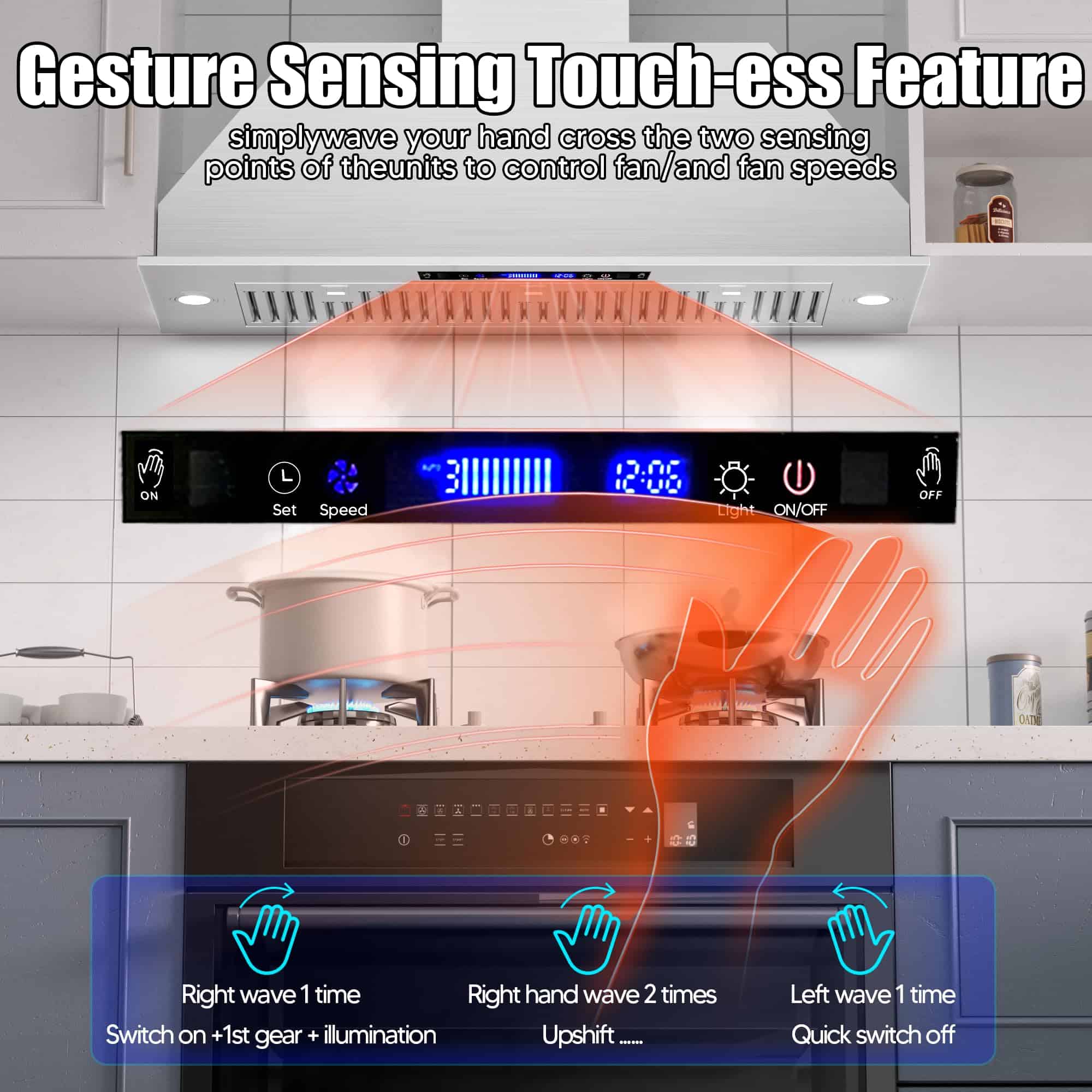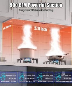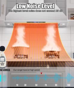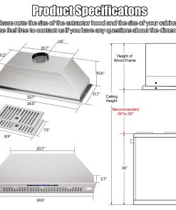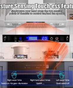 Nuestra campana extractora bajo gabinete de 36 pulgadas está equipada con 2 lámparas LED de 3W, que proporcionan una iluminación amplia para tus aventuras culinarias. Con 4 niveles de potencia en el ventilador, podrás eliminar al instante vapores, humo y aceite de tu cocina, ahorrando energía y reduciendo la molestia de la limpieza. Diseñada para facilitar la instalación, nuestra campana extractora de 36 pulgadas sin conductos complementa tanto cocinas modernas como clásicas. Con un tamaño compacto de 34.5»x11.7»x10.6», se ajusta perfectamente debajo de los gabinetes o puede ser montada en la pared, ahorrando espacio valioso. El diámetro de la salida de aire de 6» asegura una ventilación eficiente en toda tu cocina. La limpieza es muy sencilla gracias a nuestros filtros de acero inoxidable fáciles de quitar, que son aptos para lavavajillas. El diseño sin botones, la pantalla táctil y el apagado retardado hacen que el uso diario sea sencillo. Toma el control del ambiente de tu cocina con los ajustes de 4 velocidades que te permiten ajustar tanto la potencia como los niveles de ruido con facilidad. Nuestra campana extractora está equipada con controles táctiles que responden a gestos para una operación sin problemas. Simplemente desliza o toca para ajustar los ajustes con facilidad. Además, también se puede operar de forma remota a través del control remoto incluido, lo que la hace perfecta para padres o dueños de mascotas multitarea. Configura temporizadores y personaliza ajustes fácilmente para mayor comodidad.