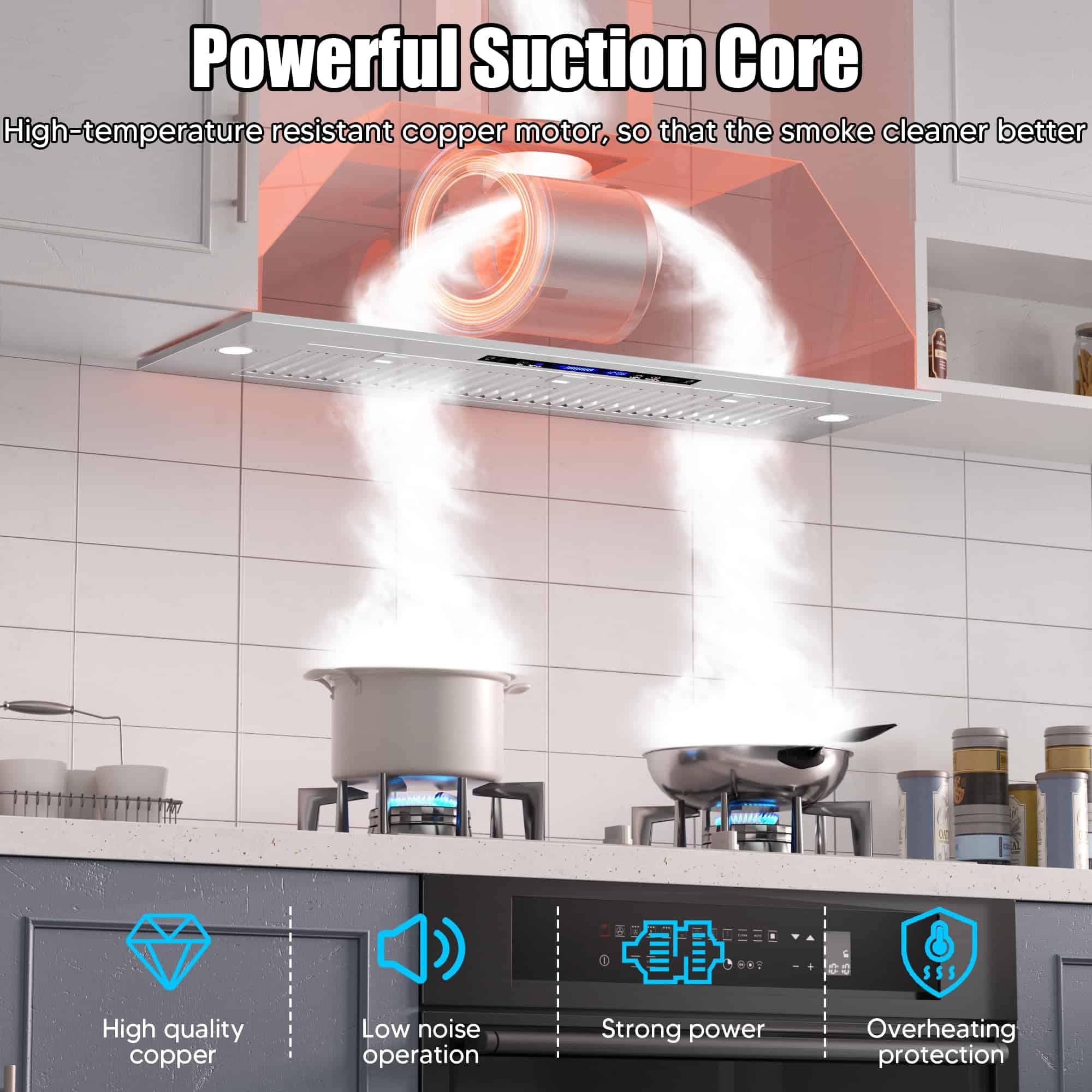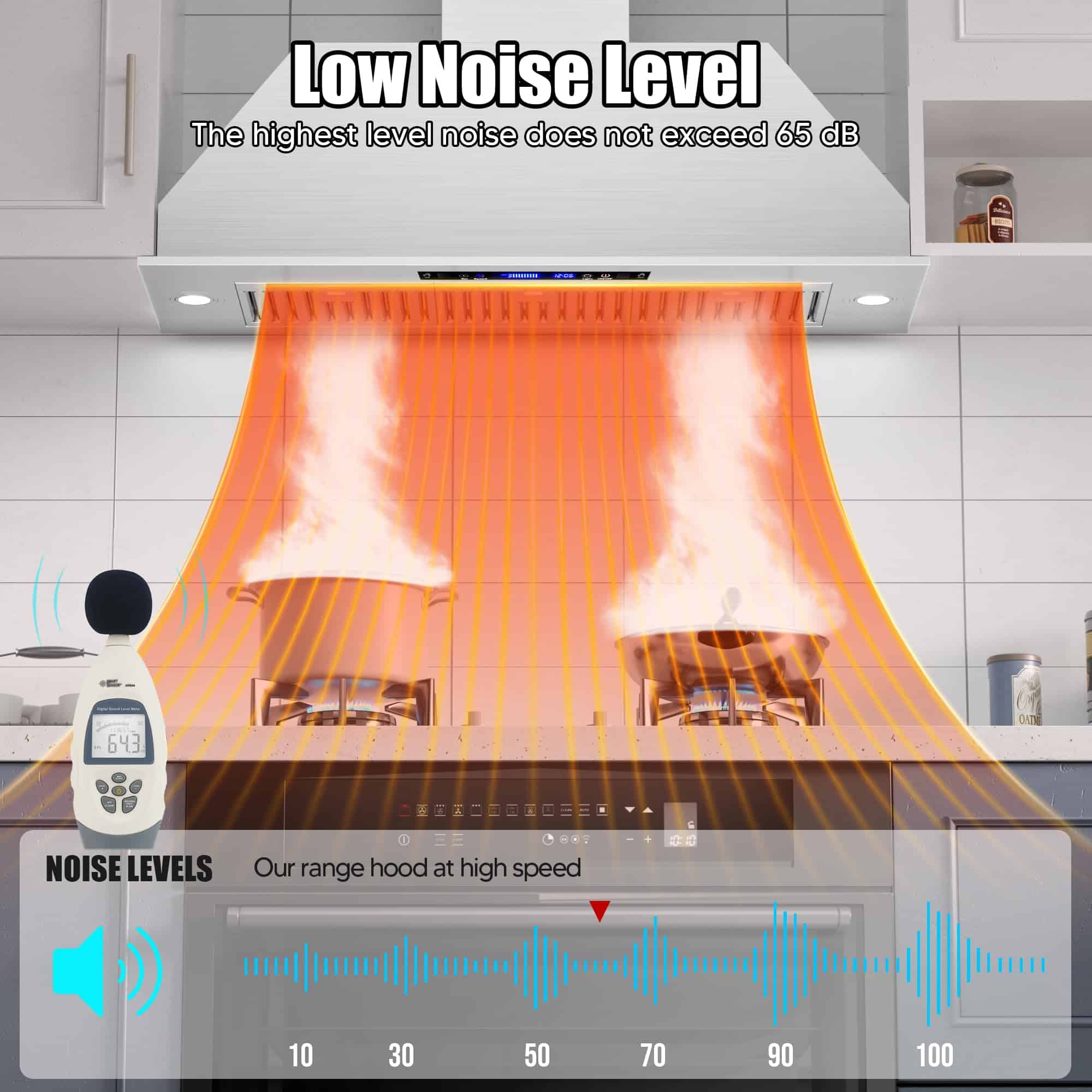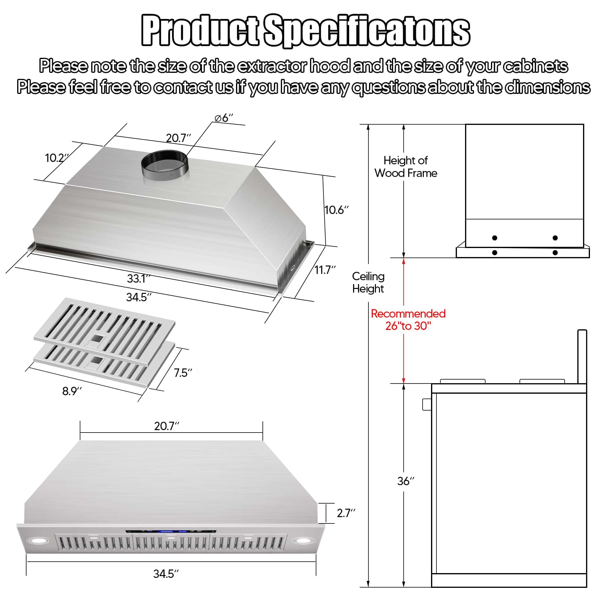 Nuestra campana extractora bajo gabinete de 36 pulgadas está equipada con 2 lámparas LED de 3W, que proporcionan una iluminación amplia para tus aventuras culinarias. Con 4 niveles de potencia en el ventilador, podrás eliminar al instante vapores, humo y aceite de tu cocina, ahorrando energía y reduciendo la molestia de la limpieza. Diseñada para facilitar la instalación, nuestra campana extractora de 36 pulgadas sin conductos complementa tanto cocinas modernas como clásicas. Con un tamaño compacto de 34.5»x11.7»x10.6», se ajusta perfectamente debajo de los gabinetes o puede ser montada en la pared, ahorrando espacio valioso. El diámetro de la salida de aire de 6» asegura una ventilación eficiente en toda tu cocina. La limpieza es muy sencilla gracias a nuestros filtros de acero inoxidable fáciles de quitar, que son aptos para lavavajillas. El diseño sin botones, la pantalla táctil y el apagado retardado hacen que el uso diario sea sencillo. Toma el control del ambiente de tu cocina con los ajustes de 4 velocidades que te permiten ajustar tanto la potencia como los niveles de ruido con facilidad. Nuestra campana extractora está equipada con controles táctiles que responden a gestos para una operación sin problemas. Simplemente desliza o toca para ajustar los ajustes con facilidad. Además, también se puede operar de forma remota a través del control remoto incluido, lo que la hace perfecta para padres o dueños de mascotas multitarea. Configura temporizadores y personaliza ajustes fácilmente para mayor comodidad.