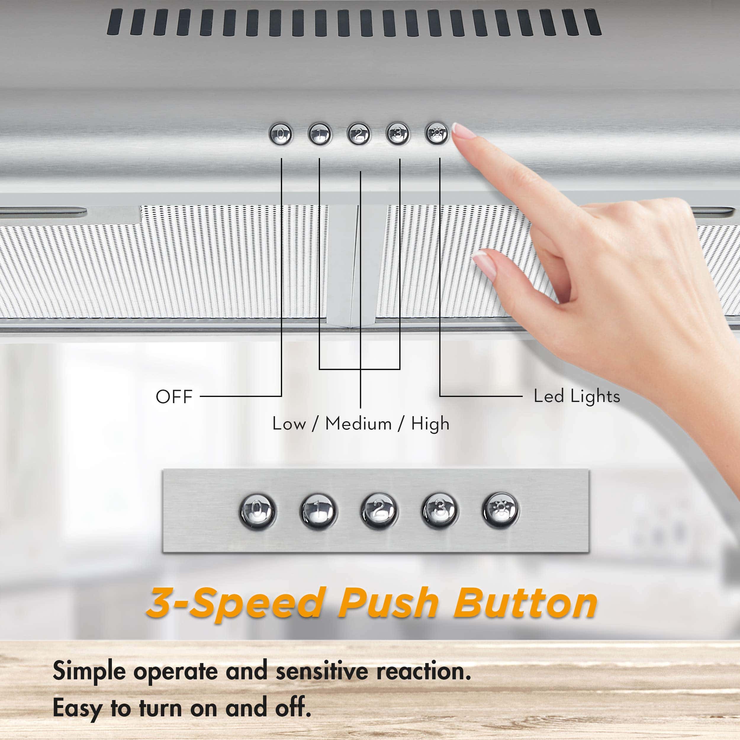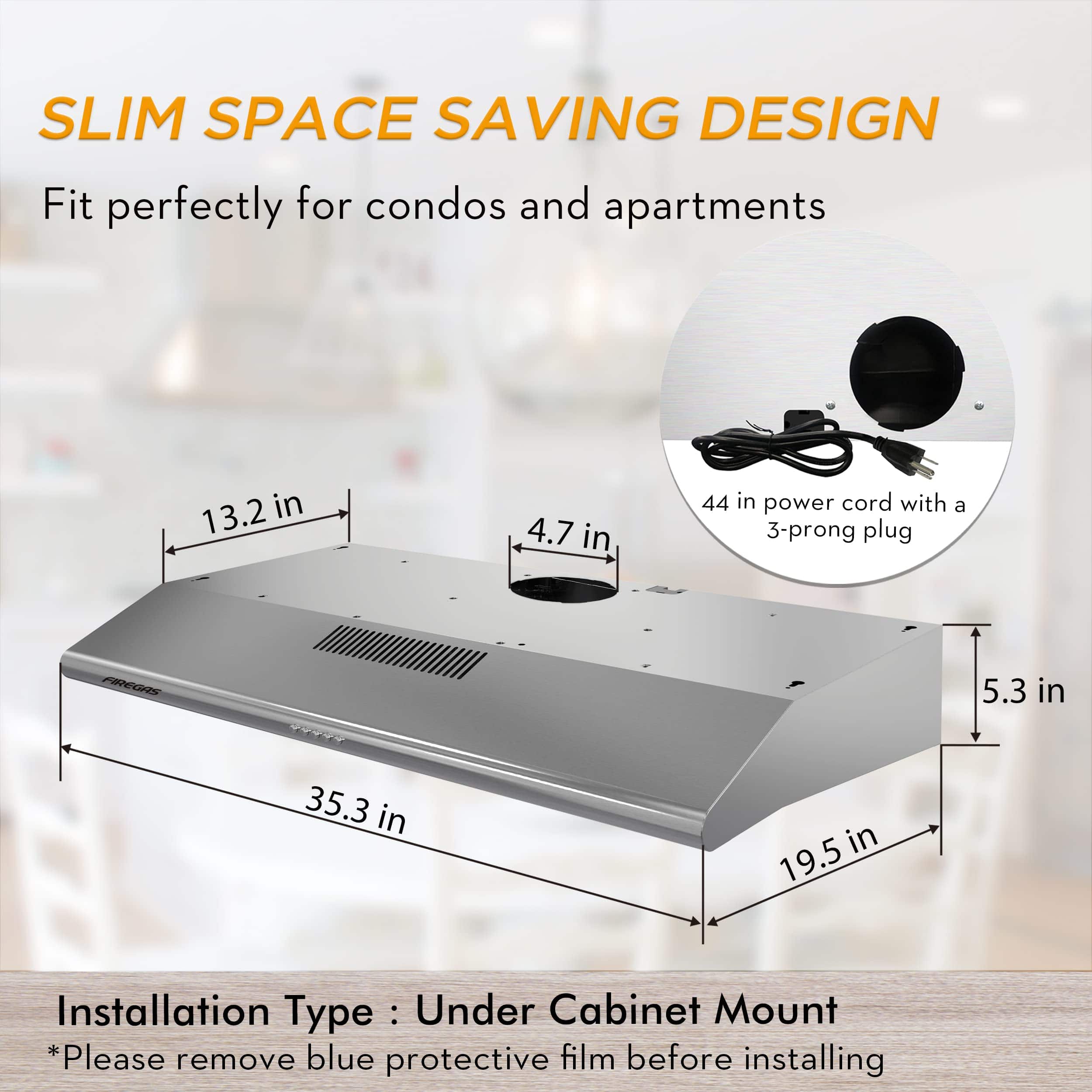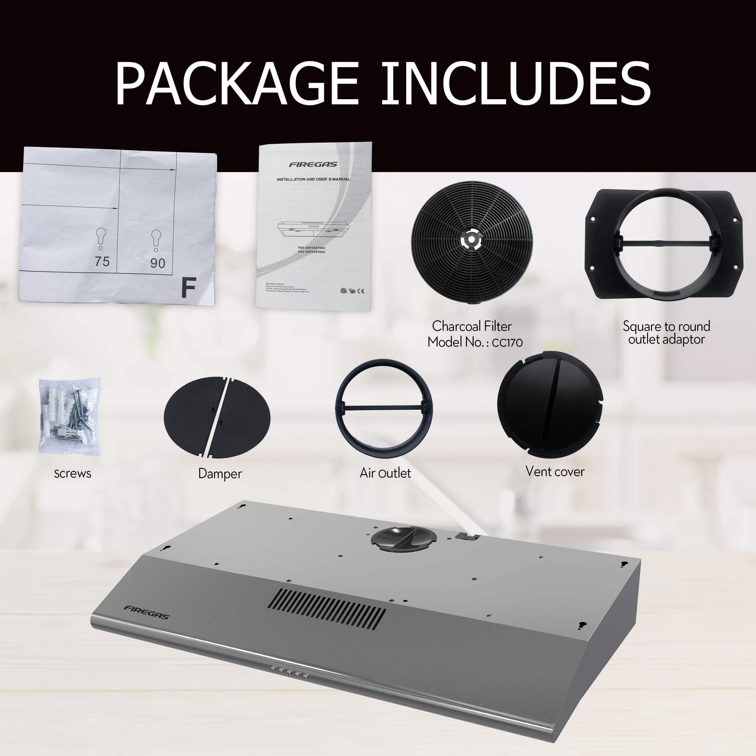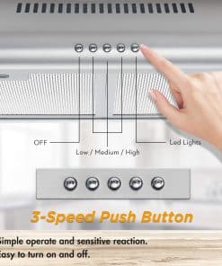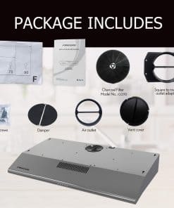 La nueva campana extractora de cocina de FIREGAS está hecha con un alto estándar de acero inoxidable calidad premium de 0.8 mm, es altamente resistente a la corrosión y se puede usar a largo plazo. Esta campana de 36 pulgadas bajo gabinete cuenta con un diseño delgado de ahorro de espacio y moderno para cualquier decoración de cocina. Motor potente pero silencioso con un flujo de aire de 200 CFM, manteniendo los niveles de ruido por debajo de 54 dB a alta velocidad. 3 velocidades de ventilador para elegir. Filtros permanentes aptos para lavavajillas, fáciles de limpiar. 2 luces LED te ofrecen una visión más brillante y cómoda. Especificaciones: Modelo de Campana: FGS-USF22A90AC Modelo de Filtro de Carbón: CC170 Material: acero inoxidable cepillado grueso 430 Estilo de Montaje: Bajo gabinete Dimensiones: 36″ x 19.5″ x 5.3″ Tamaño del Paquete: 38» x 22.4» x 8.3» Peso Neto: 13.1 lbs Fuente de Alimentación: Enchufable Voltaje Nominal: 120V / 60Hz (Estándar de EE. UU. y Canadá) Tamaño de Ventilación: Diámetro del tubo de 4.7″ Motor: motor de ventilador, 1X 80W Potencia de Luz: 2X1.5W LED incorporado Flujo de Aire: 3 Velocidades con Máx. 200CFM Nivel de Ruido: 54DB Tipo de Control: Control de botones de presión Filtros: 3 Filtros de aluminio de 3 capas, 1 filtro de carbón Instalación: Ventilación superior, Enchufe de 3 clavijas Opciones de Chimenea: No proporcionadas. Ductless / Ventless: Compatible (viene con filtro de carbón) Certificación: Cumplimiento con los Estándares de Seguridad de EE. UU. y Canadá Garantía: Garantía Limitada de 5 Años en Piezas