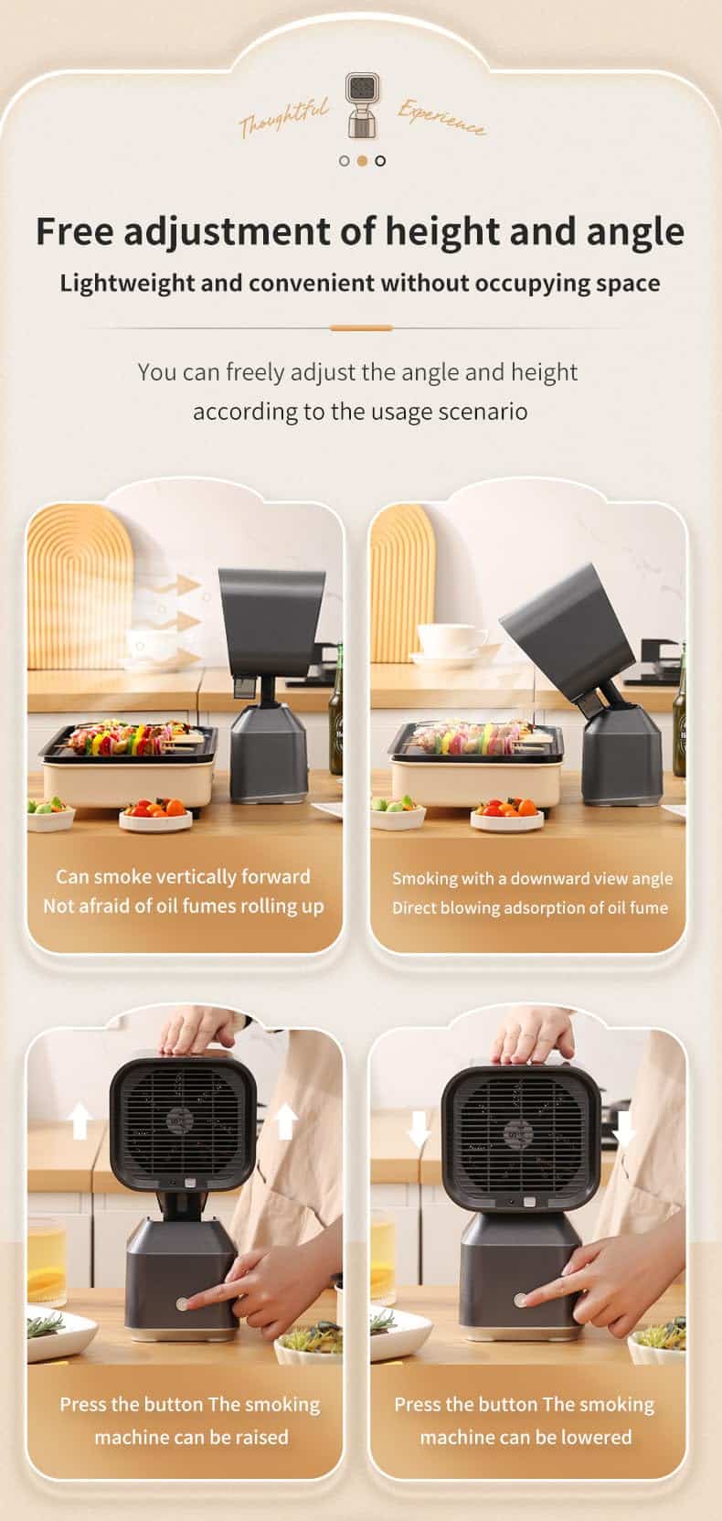 Campana extractora portátil para escritorio y campana extractora móvil con altura y ángulo ajustables. Minicampana extractora de cocina para uso en interiores, RV, barbacoa. Color: Gris. Características: 1. Fácil de mover y usar libremente en diferentes lugares. 2. Pantalla del filtro desmontable para una fácil limpieza. 3. Caja de almacenamiento de aceite de gran capacidad. 4. Filtración de 2 capas para eliminar eficientemente los humos y olores. 5. Diseño portátil y ajustable en dos velocidades. 6. Garantía de calidad de un año. Contacte con nosotros si tiene preguntas.