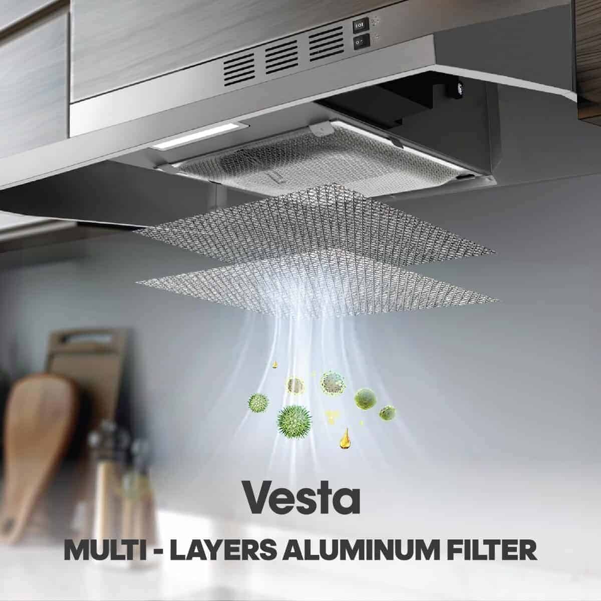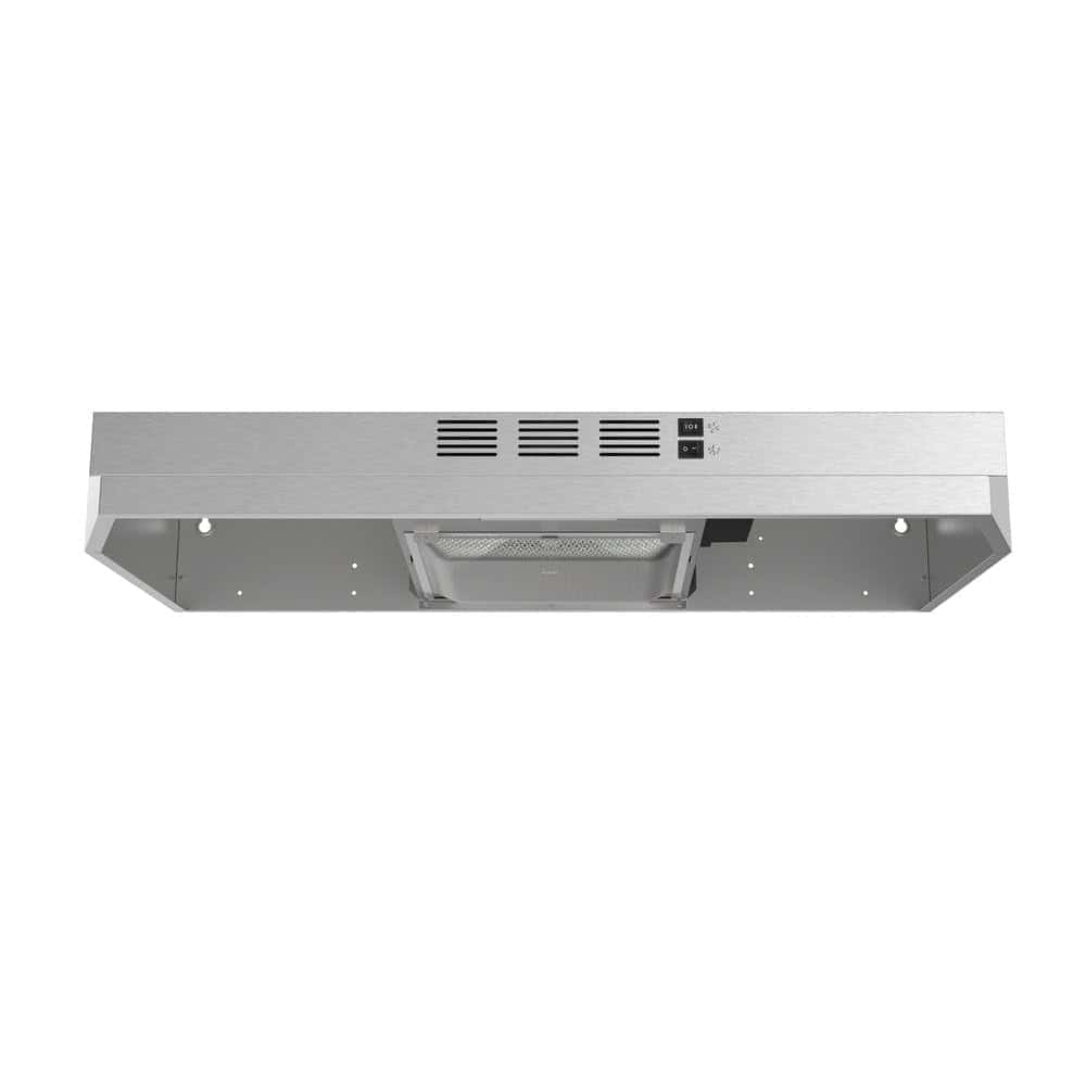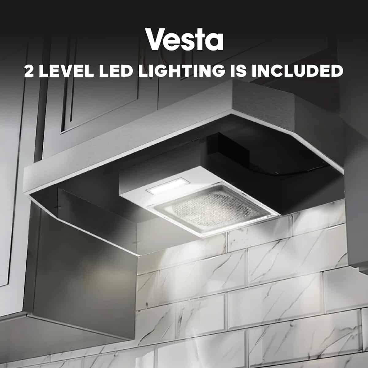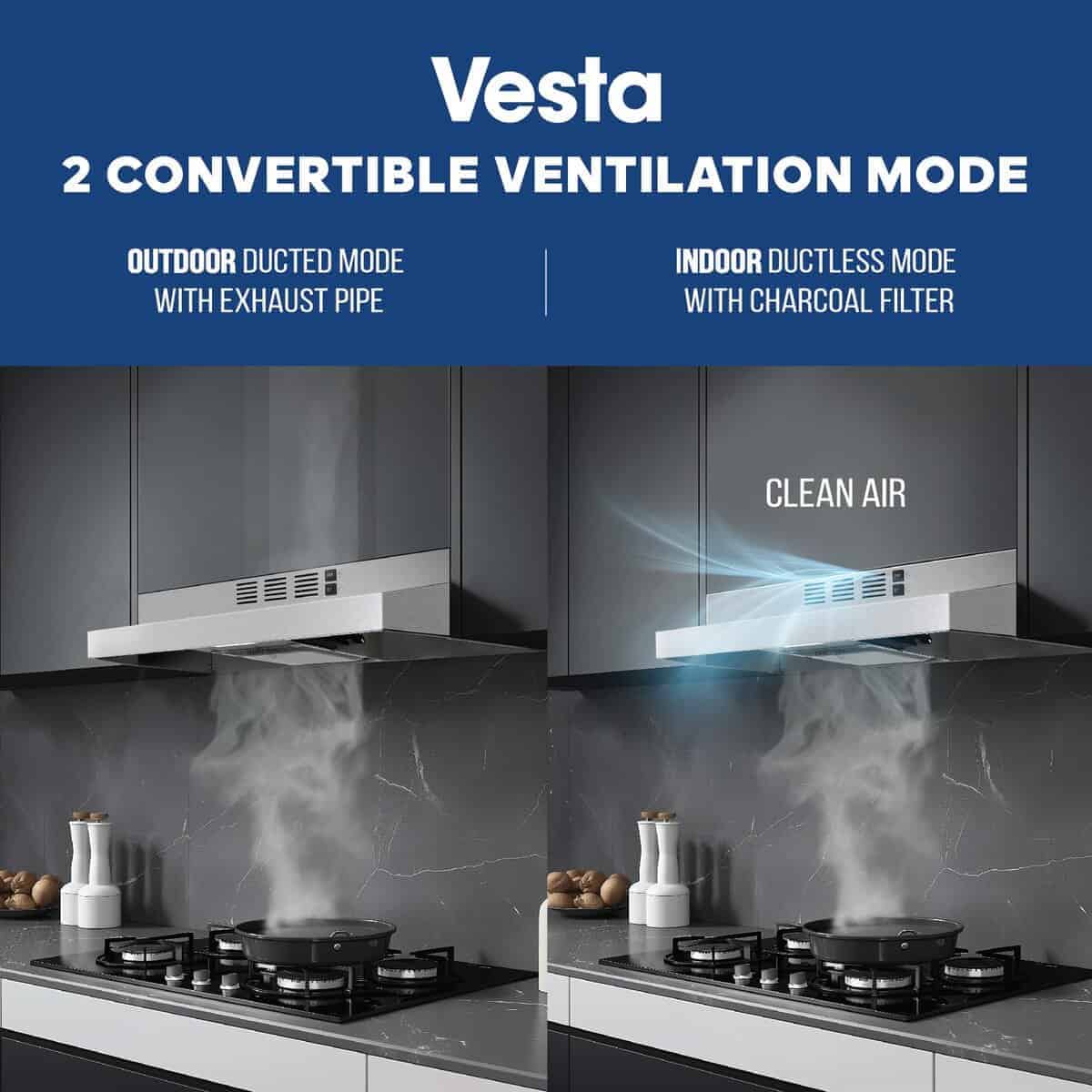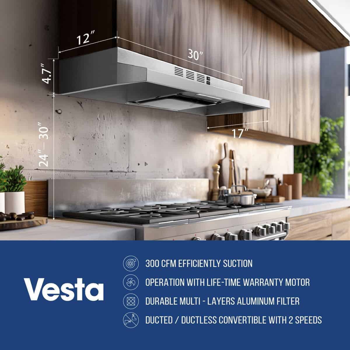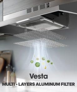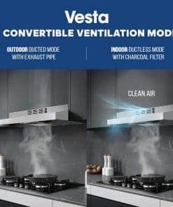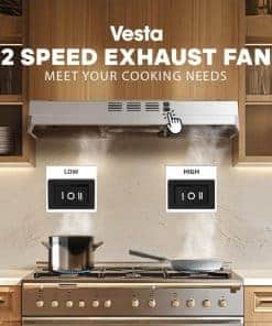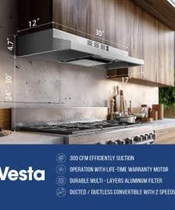 Campana extractora Vesta Cincinnati 30″ de acero inoxidable convertible con o sin conducto con control de botón flexible, 2 niveles de velocidad, potencia de succión de 300 CFM y filtro de aluminio multicapa lavable a máquina. Mejora la calidad del aire de tu cocina con la campana extractora bajo gabinete Vesta de alta calidad. Equipada con un ventilador de escape de 2 velocidades, este eficiente sistema elimina rápidamente una gran parte del humo y los olores de la cocina, manteniendo niveles de ruido mínimos. Ofrece opciones de instalación con o sin conducto, con un filtro compuesto de malla de aluminio y algodón de carbón activado y un filtro de malla de aluminio reutilizable. Estos filtros son aptos para lavavajillas para un mantenimiento fácil. Fabricada con acero inoxidable de calidad 430, esta campana extractor… (truncated)