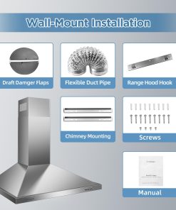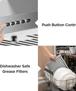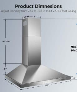 Especificación Longitud del Producto: 29.3 pulgadas Ancho del Producto: 18.3 pulgadas Altura del Producto: Ajustable 22.6 – 36.6 pulgadas Peso del Producto: 21.34 lbs Ubicación de la Salida de Escape: Superior Tipo de Ventilación: Ventilado Tamaño de la Ventilación: 6″ Redonda Tipo de Montaje: Montaje en Pared Velocidades del Ventilador: 3 Velocidades Flujo de Aire del Ventilador de Escape: 450 CFM Tipo de Control: Botón Táctil Lámparas: 1 X Bombilla LED de 2W(s) Incluida: Sí Material del Filtro: Filtros de Acero Inoxidable Filtro Aptos para Lavavajillas: Sí Filtro de Grasa Removible: Sí Número de Filtros: 2 Nivel de Ruido: Menos de 55 db Voltaje Nominal: 120V / 60Hz (Estándar de EE. UU. y Canadá) Conexión: Enchufe de 3 puntas Paquete Incluido: 1 x Campana Extractora; 2 x Cubierta de Chimenea de Acero Inoxidable; 2 x Filtros de Acero Inoxidable; 1 x Tubo Flexible Suave; 1 x Instrucciones; Kits de Instalación