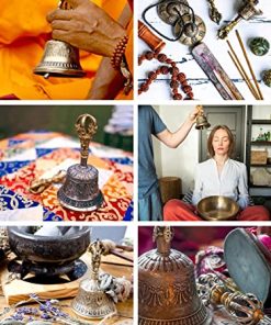 Campana de meditación tibetana hecha de aleación de siete metales tibetanos a base de latón; Hecho a mano en la región del Himalaya de Nepal; Resistente, duradero y libre de plomo; No se desvanecerá, oxidará o manchará; Portátil y fácil de tocar. . Campana de meditación budista con un sonido resonante largo; Campana de mano tibetana para meditación diaria, yoga, oración, ritual, decoración de altar, sesiones de chakra y terapia de sonido. Campanas de meditación con un sonido perfectamente entonado para sincronizar las ondas cerebrales y mejorar la conciencia de la conexión mente-cuerpo; Tres formas de tocar: agitar, golpear con el dorje o frotar el borde con un batidor de madera. Campanas budistas en caja de regalo; Úselo como campana de limpieza de espacios para mantener alejados a los espíritus malignos, una campana de cena, campana de escritorio, campana de altar, campana de llamada de mano, decoración de habitación o estante. Juego de 2 piezas de campana tibetana y dorje