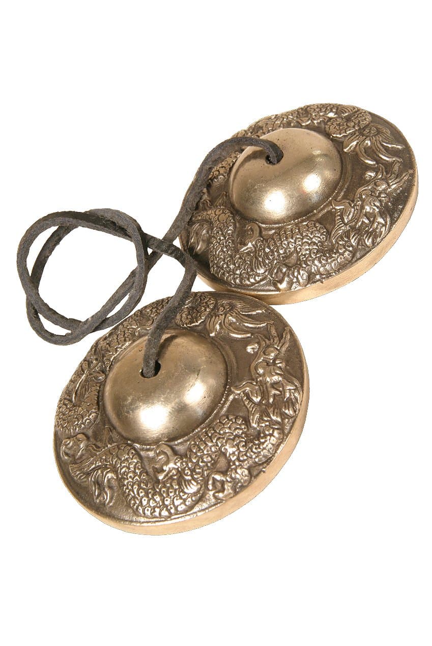 Campana Timsha. País de origen: India. 2 libras. Hecho por Mid-East. El Dragón en las Campanas Timsha, considerado un protector o guardián. Las campanas Timsha son un artefacto ritual utilizado por Monjes Budistas, así como en las tradiciones Chamanistas. Las Timsha están hechas de una aleación compleja de bronce (cobre y estaño) además de hierro y zinc. Miden 3.00″ de diámetro. Cuando estas campanas únicas de mano chocan entre sí, producen un sonido claro, puro y limpiador que puede ser utilizado para enfocar la mente antes y después de la meditación. Al ser tocadas como un instrumento, pueden usarse como un címbalo o una campana. También pueden ser utilizadas para limpiar el espacio de energías negativas.