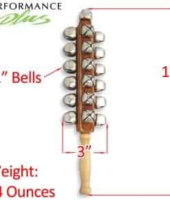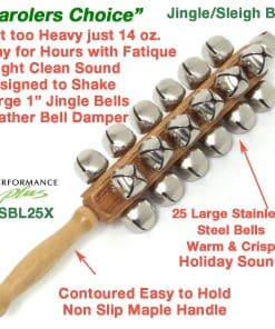 Las campanas de trineo Performance Plus producen un sonido limpio, nítido y brillante. Las campanas Performance Plus son sorprendentemente ligeras y fuertes ya que hay 25 campanas de acero inoxidable de 1 pulgada y mango cónico de arce duro. Lo suficientemente fuerte pero sin dominar tu música. El agarre contorneado es resistente y fácil de sostener para tocar durante mucho tiempo, sin la fatiga de la muñeca de las campanas de mano diseñadas para orquestas y estudios de grabación. La mayoría de campanas orquestales profesionales son difíciles de sostener y muy pesadas. Para tocarlas la mayoría de videos recomiendan agarrar el mango, darle la vuelta y mientras se sostiene, usar la otra mano para golpear la parte inferior del mango en lugar de solo agitar. Las campanas orquestales no son muy prácticas para campaneros no profesionales. Las campanas de trineo de mano Performance Plus son fáciles de usar, simplemente agarra el mango de arce y agita ligeramente las 25 campanas hacen todo el trabajo y producirán ese brillante y animado sonido. Son divertidas de usar incluso por un tiempo prolongado. A diferencia de otras campanas de orquesta negras y pesadas, que no son muy prácticas para un uso ocasional. Las campanas de trineo Performance Plus han estado fabricando un instrumento diseñado para paseantes de villancicos, programas escolares de Navidad, coros de iglesia o cualquier persona que use actuaciones en directo en el escenario. Si quieres diversión, solo agita tus campanas Performance Plus SBL25X. Son perfectas para ese sonido de vacaciones, y como acompañamiento para tu música favorita. Las campanas de trineo de la serie SBL25 de Performance Plus tienen 13 pulgadas de largo y aún pesan menos de una libra (14 onzas). Perfectas para esa larga noche de villancicos sin fatiga en la muñeca. El mango cónico está hecho de arce roca duro. Viene con 25 campanas de acero inoxidable unidas a un auténtico amortiguador de cuero sujeto en el mango. Perfecto para conciertos de pesebres navideños, actuaciones navideñas y con un precio razonable para todos en el grupo. No tienes que estar en el Ejército de Salvación para ser un campanero. Genial durante todo el año para celebraciones navideñas, Navidad en julio, te pone en el espíritu navideño, pero también es bueno para música latina y de reggae, festivales de invierno, música de iglesia y reuniones familiares. Un imprescindible para el anuncio de que Santa viene a tu casa.