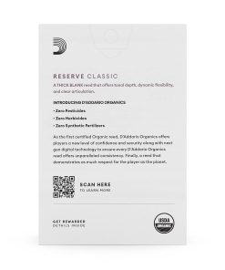 Como la primera caña certificada orgánica, D’Addario Organics ofrece a los músicos un nuevo nivel de confianza y seguridad junto con tecnología digital de última generación para garantizar que cada caña D’Addario Organics ofrezca una consistencia sin igual. Organic Reserve Evolution cuenta con la caña más gruesa de la línea Reserve de clarinete. Ofrece un sonido redondo, una espina gruesa para una proyección aumentada, una punta más gruesa para una articulación mejorada, y mayor calidez tonal y flexibilidad. Cada caña del paquete viene sellada individualmente en un estuche de caña de papel reciclable y envoltura de flujo.