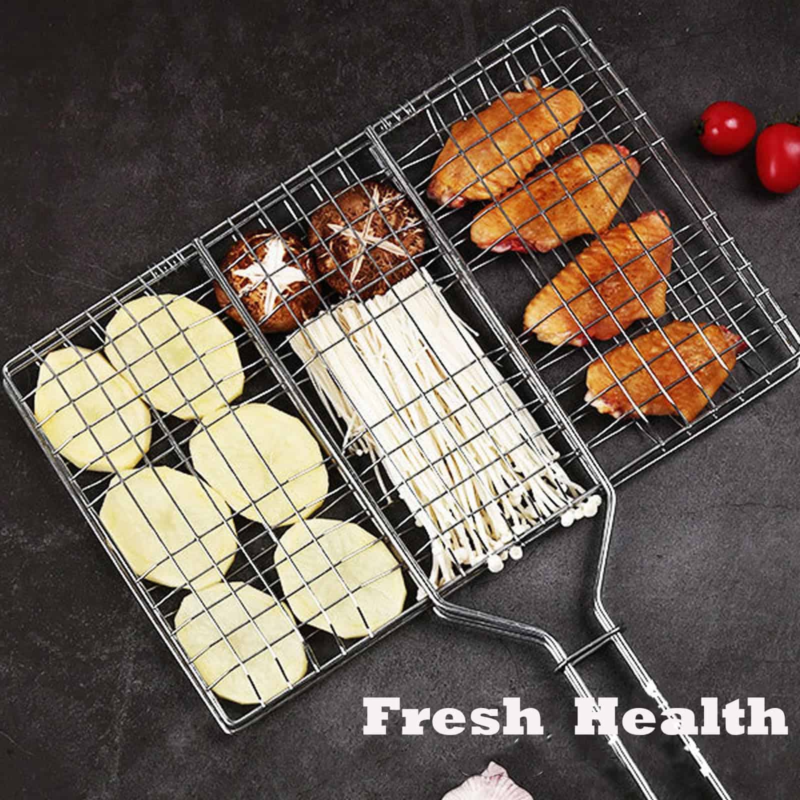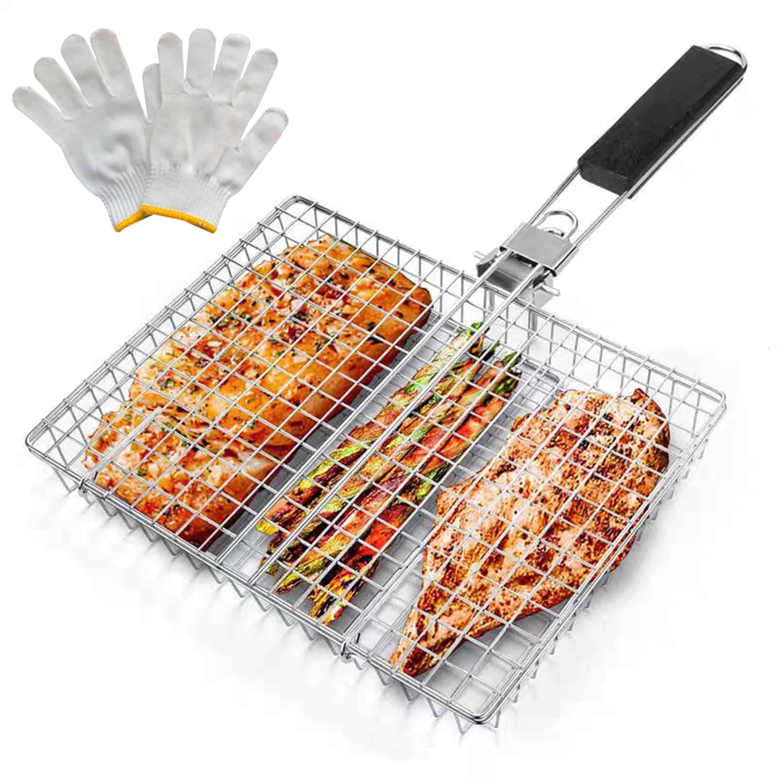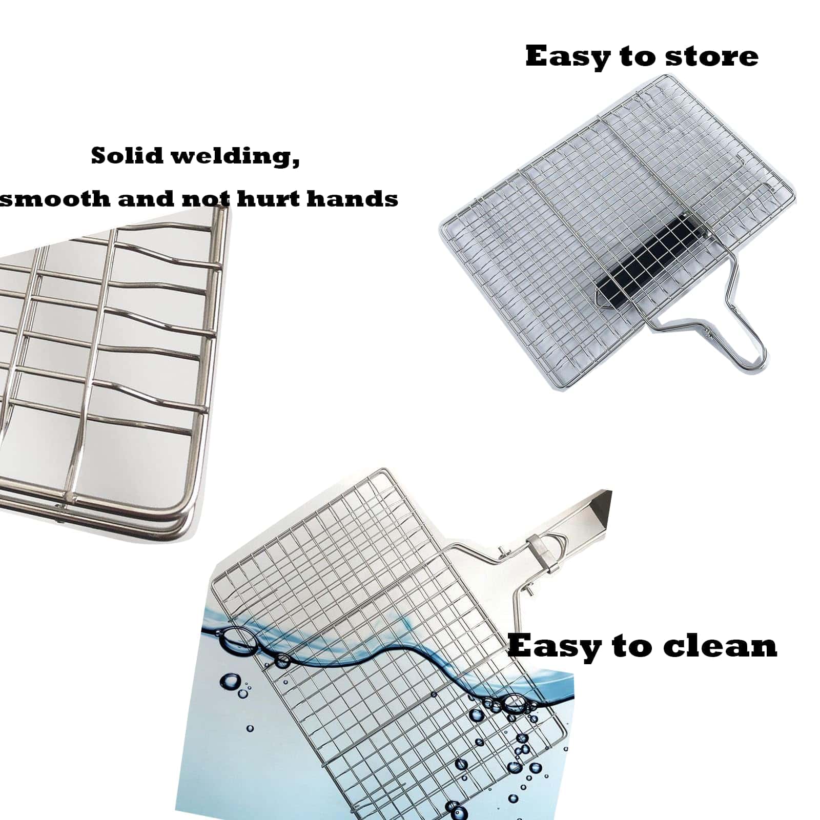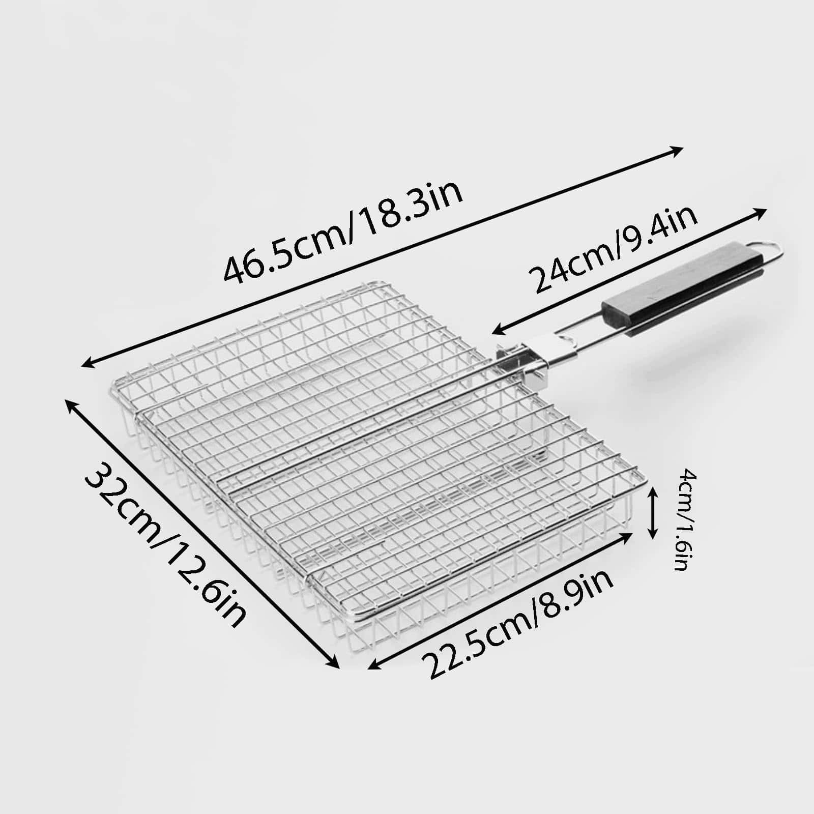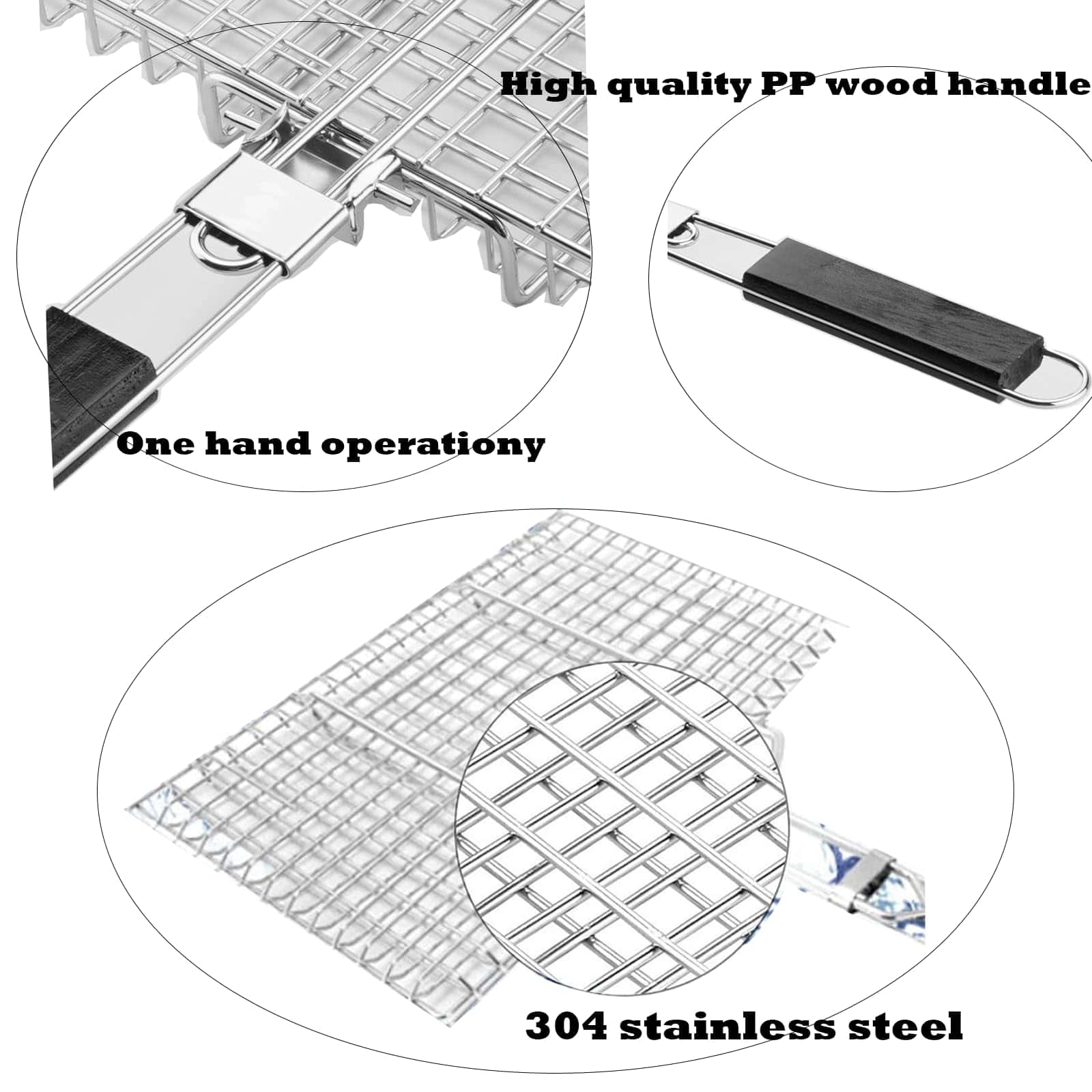 La canasta para parrilla cuenta con mangos desmontables resistentes al calor para facilitar el acceso a una variedad de alimentos en su interior. Puede cocinar carnes, pescados enteros, filetes, chuletas de pollo, mariscos, verduras, hamburguesas, etc. Los mangos se pueden quitar y colocar dentro de la canasta para un fácil almacenamiento y transporte. ¡Ideal para barbacoas familiares o reuniones al aire libre gourmet!
