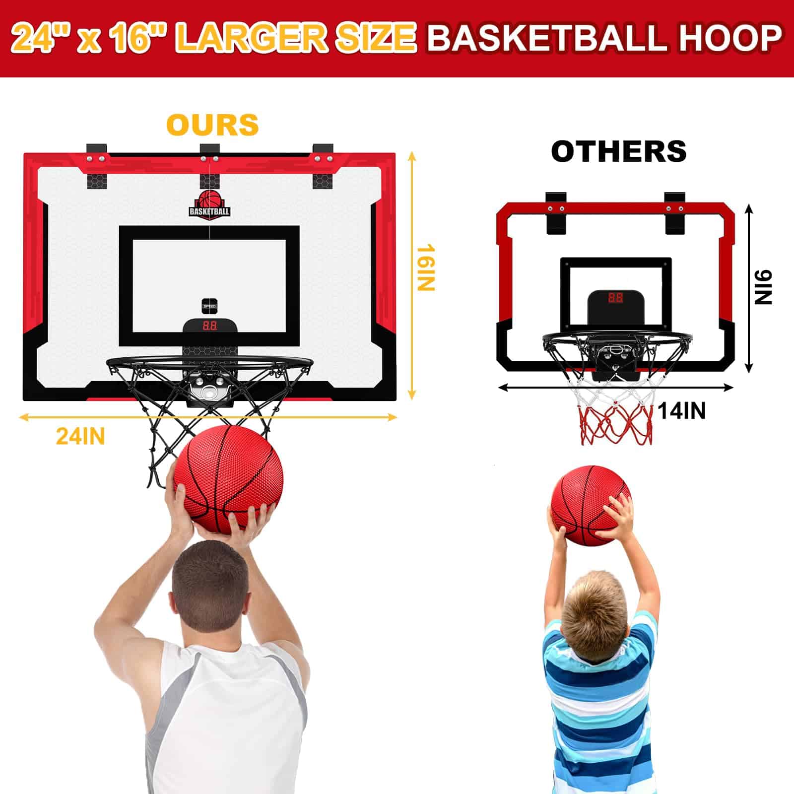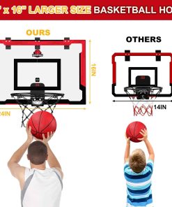 1. Canasta de baloncesto grande mejorada: Nuestro tamaño de tablero es de 24″ x 16″ y el set de juguetes de baloncesto viene con balones grandes y pequeños para adultos y niños. Los adultos pueden disfrutar lanzando a la canasta y aliviar el estrés durante los descansos. Las canastas de baloncesto de tamaño mayor brindan una mejor experiencia de clavadas.
