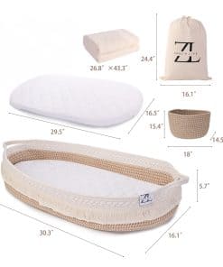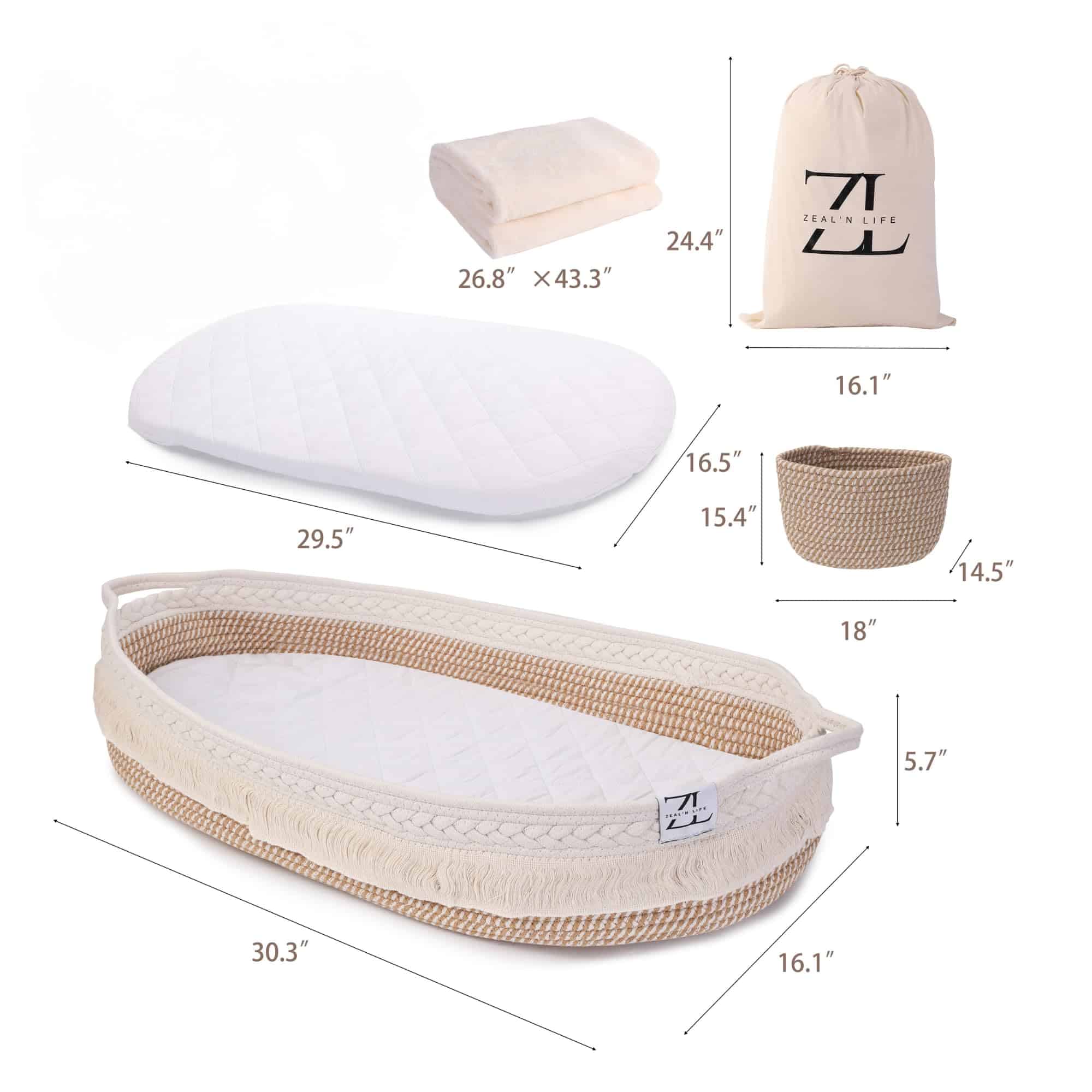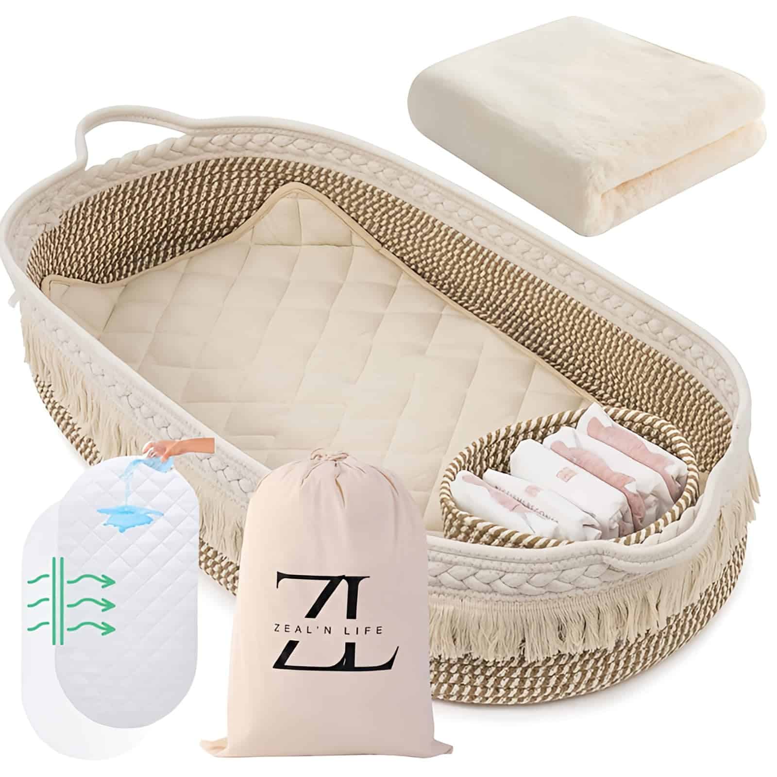 1. GRAN PAQUETE DE CANASTA DE CAMBIO PARA BEBÉ, MÚLTIPLES SORPRESAS: ZEAL’N LIFE ofrece múltiples artículos con la canasta de bebé moisés que son de calidad premium y 100% algodón orgánico, el paquete de colchoneta de cambio para cajón incluye 1x Canasta de Cambio Grande para Bebés, 1x Manta para Bebés, 1x Organizador de Pañales, 1x Colchoneta de Cambio Portátil con Funda Impermeable 1x Bolsa de Almacenamiento Grande, todos los artículos son únicos y el regalo perfecto para mamás embarazadas, un completo imprescindible para recién nacidos.