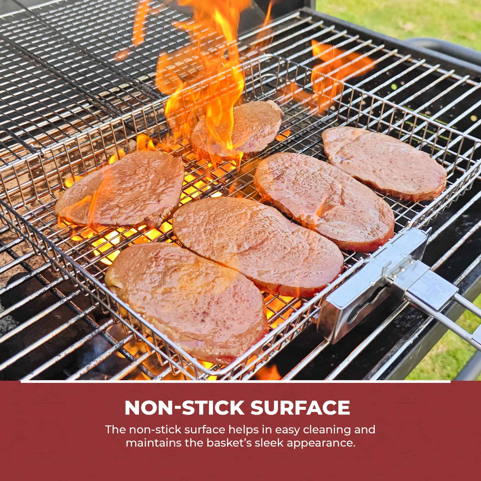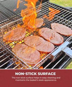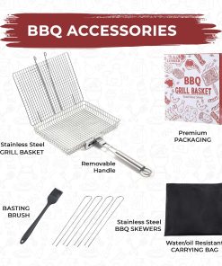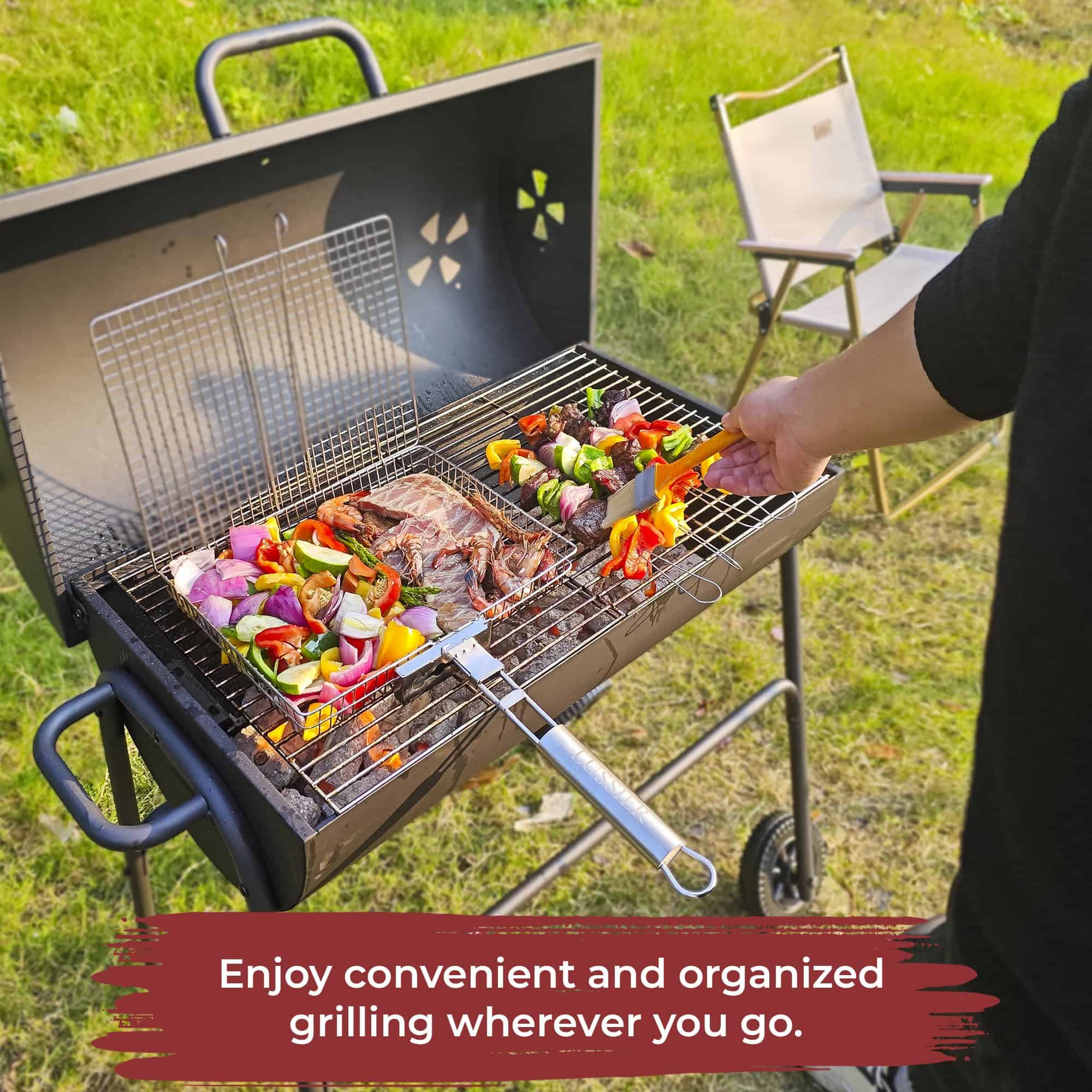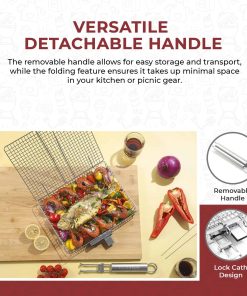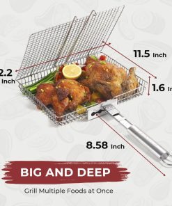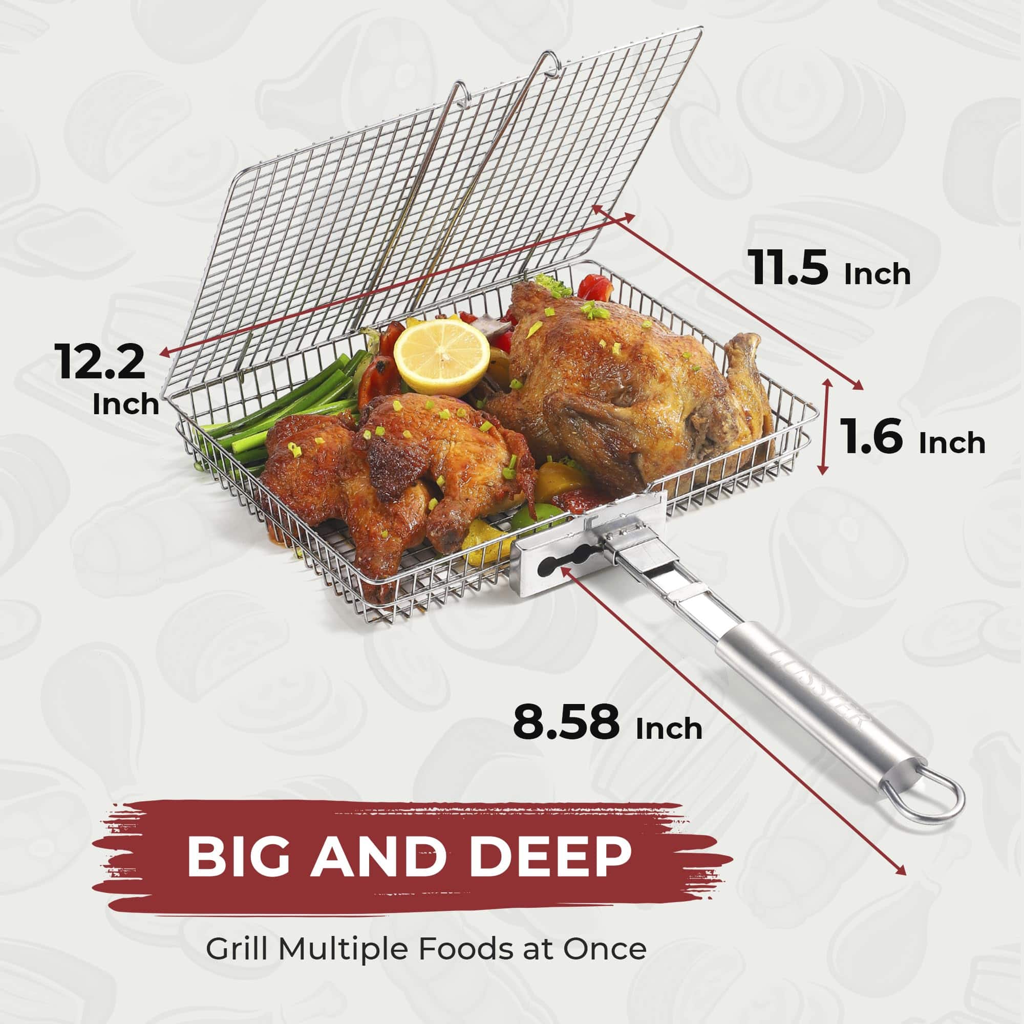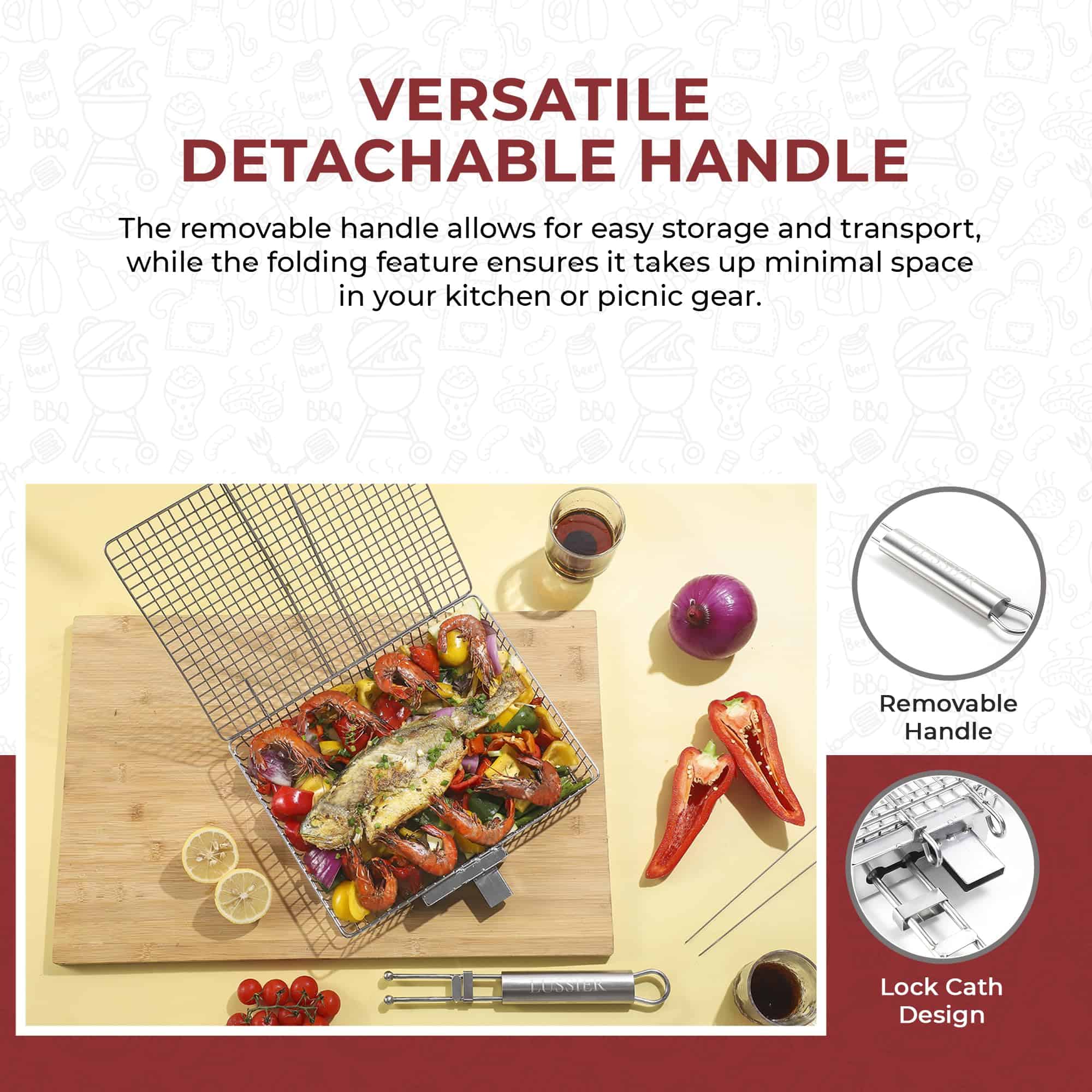 Nuestra canasta de parrilla de camarones ofrece una excelente versatilidad al asar a la parrilla. Su asa desmontable permite un control óptimo al voltear los alimentos o desprenderla para una cocción uniforme, además de facilitar el almacenamiento compacto. Hecho de acero inoxidable premium, garantiza durabilidad, resistencia al óxido y la capacidad de soportar altas temperaturas. La amplia rejilla de malla mantiene seguros los alimentos más pequeños durante la cocción a la parrilla, evitando que se caigan a través de las parrillas. Con un espacioso espacio de cocción, la canasta para parrilla de pescado es ideal para asar verduras, pescado, pollo, carnes y más, siendo perfecta para reuniones familiares y barbacoas. Nuestra versátil canasta para parrilla de camarones cuenta con una superficie antiadherente para una fácil limpieza y un diseño plegable, lo que la hace portátil y fácil de almacenar. Nuestra canasta de plegado para parrilla también incluye un juego completo para parrilla, con un asa desmontable, pincel para asar, 4 brochetas para parrilla y una bolsa resistente al agua/aceite, garantizando una experiencia de parrilla sin complicaciones. La tapa con cierre evita que los alimentos se caigan y los lados duales aseguran una cocción uniforme. Ya sea que estés asando a la parrilla en casa, acampando o en un picnic, la canasta de parrilla ajustable ofrece la solución perfecta para cocinar al aire libre.