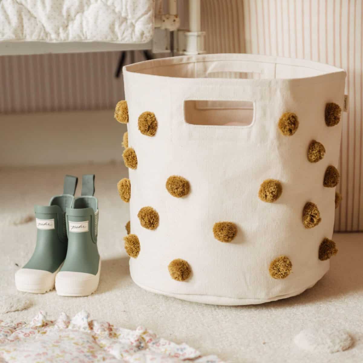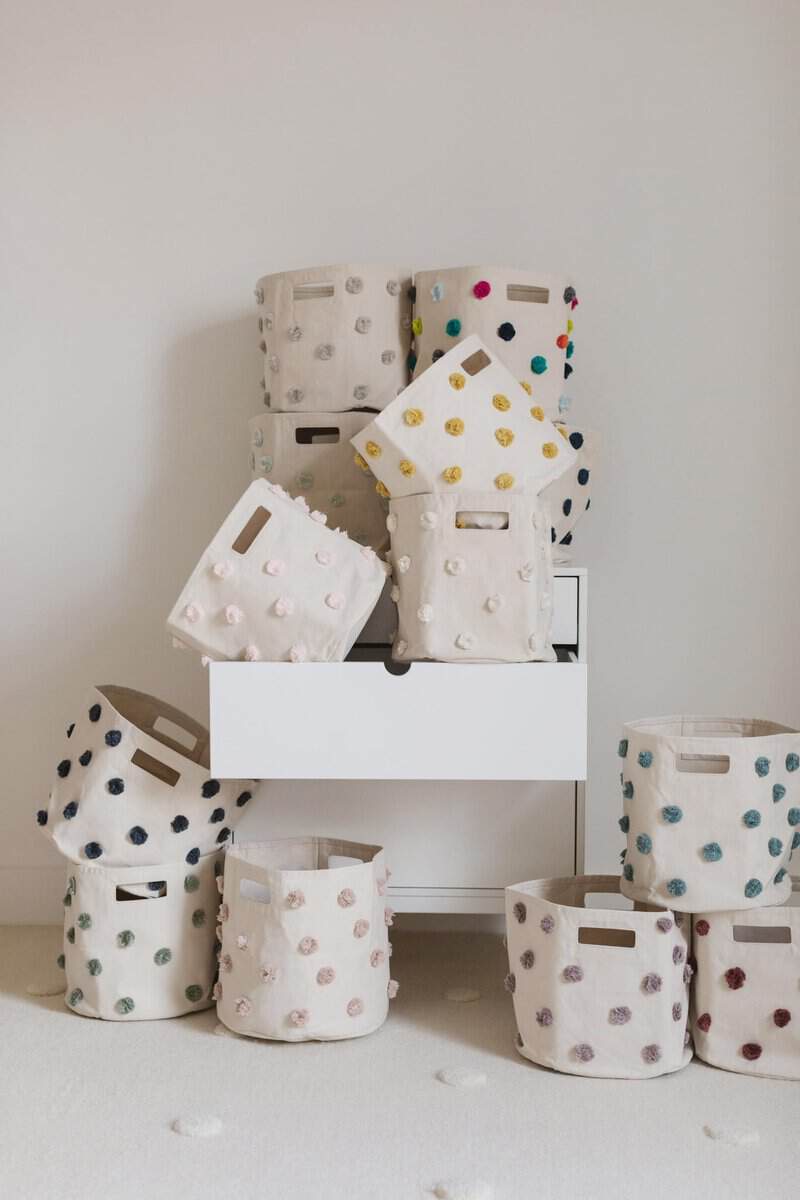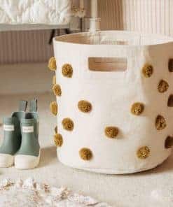 Guarda libros, trenes y suministros de manualidades. Ideal para los tesoros de tu pequeño o como un contenedor para toda la familia. Con cada Pom Pom cosido a mano, nuestros cubos Petit Pehr Pom Pom son de lienzo de algodón resistente al 100% y vienen en colores Blush, Mint, Grey y Multi. 13″d x 12″h.